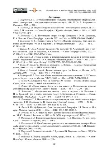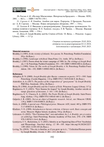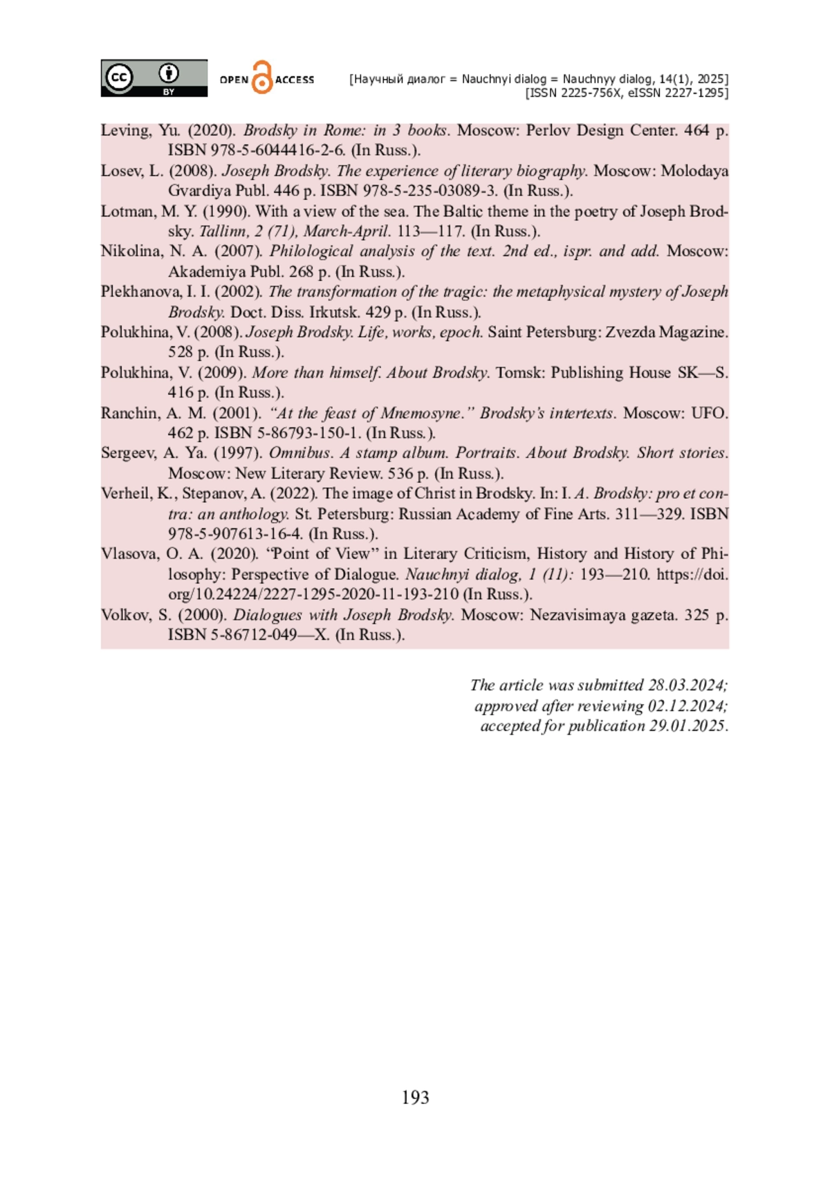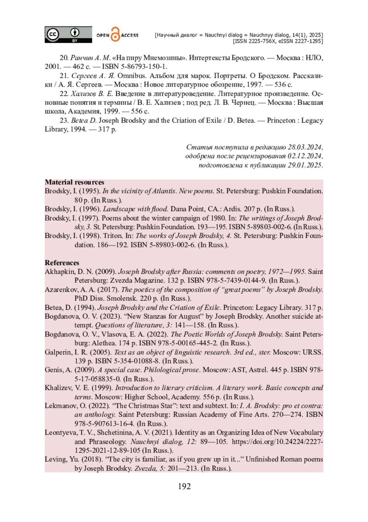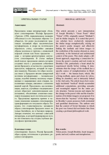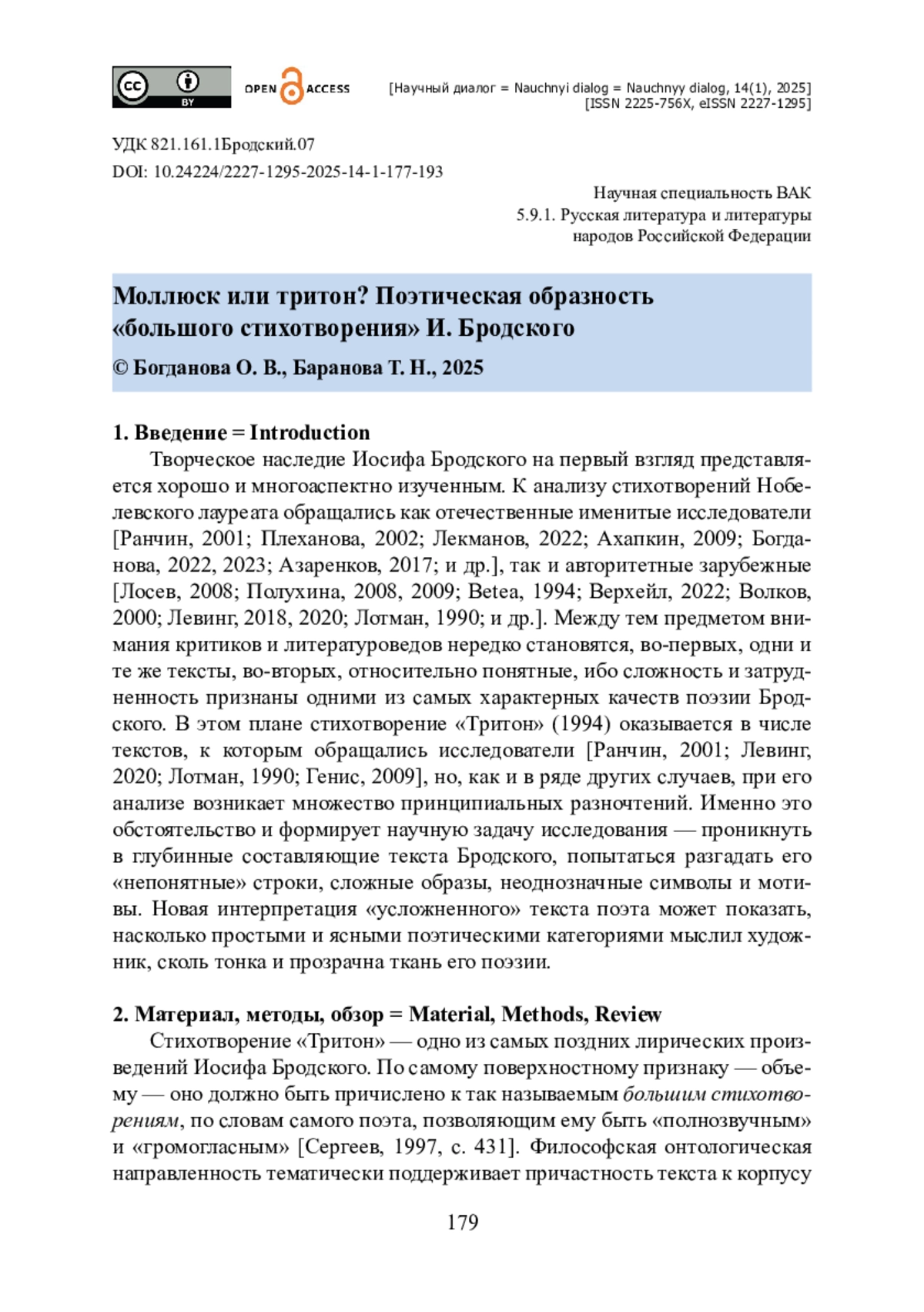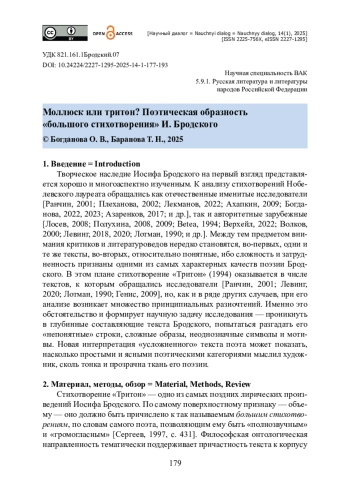 БОГДАНОВА О. В., БАРАНОВА Т. Н. МОЛЛЮСК ИЛИ ТРИТОН? ПОЭТИЧЕСКАЯ ОБРАЗНОСТЬ «БОЛЬШОГО СТИХОТВОРЕНИЯ» И. БРОДСКОГО // НАУЧНЫЙ ДИАЛОГ. 2025. ТОМ 14, № 1