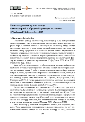 В статье рассматриваются реликты древнего культа поклонения солнцу, сохранившиеся в содержании мифов, сказочном фольклоре и в обрядовых действиях калмыков. Цель статьи — выявить следы древнего культа в фольклорной и обрядовой традиции, определить их символическое значение в сказочных сюжетах и обрядовых действиях. Материалом для исследования послужили образцы мифов, волшебных и богатырских сказок, а также обряды жизненного цикла. Доказано, что концепция божественности солнца и ее влияния на земную жизнь стала основой многих религиозно-мифологических представлений, следы которых обнаруживаются в разных аспектах духовно-религиозной жизни народа. Сообщается, что древний добуддийский календарный праздник Зул отмечается в дни зимнего солнцестояния. Анализ мифов, волшебных и богатырских сказок позволил выявить значимые мотивы: (1) так, с восходом солнца герой обретает волшебные предметы, сбываются загаданные им желания, выявляются следы нечистых сил; (2) отправляясь в путь, сказочные персонажи непременно начинают движение «посолонь», то есть по ходу движения солнца «в правильном направлении» (зөв эргәд), что сопряжено с устойчивым представлением об удачном свершении задуманного. Показано, что древняя концепция божественности небесного светила проявляется в наделении сказочного героя солярными признаками.