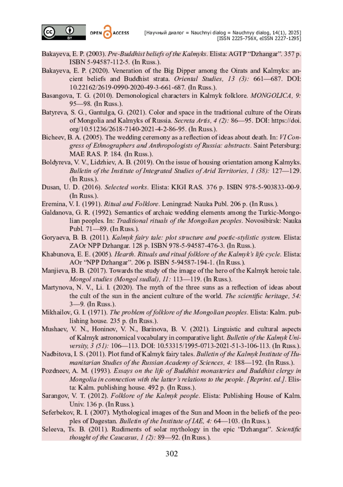 14. Болдырева В. В. К вопросу об ориентации жилища у калмыков / В. В. Болдырева, А. Б. Лиджиев // Вестник Института комплексных исследований аридных территорий. - 2019. - № 1 (38). - С. 127-129.