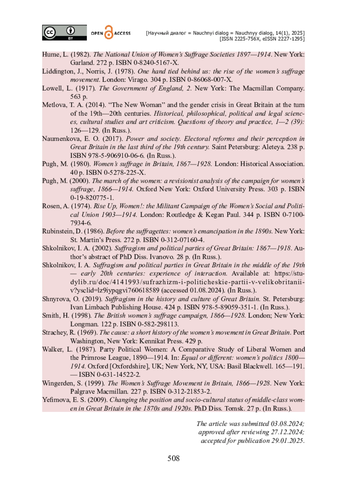 25. Школьников И.А. Суфражизм и политические партии в Великобритании в середине Х1Х - начале ХХ вв. : опыт взаимодействия [Электронный ресурс] / И. А. Школьников, О. В. Шнырова. - Режим доступа : https://studylib.ru/doc/4141993/sufrazhizm-i-politicheskie-partii-v-velikobritanii-v?ysclid=lz9iypqgvi760618589 (дата обращения 01.08.2024).