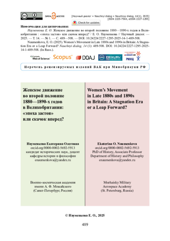 Изучается женское движение в Великобритании во 2 половине 1880—1890-х годов. Источниками выступили материалы периодической печати, публицистика, мемуары и воспоминания современников, стенограммы заседаний британского парламента. Опровергаются крайние в историографии точки зрения, что 1890-е годы были периодом упадка женского движения или, напротив, временем прорыва. Автор приходит к выводу, что в указанный период шло постепенное развитие, сопровождающееся взлетами и неудачами. Сообщается, что, с одной стороны, расширялся социальный состав и совершенствовалась организационная структура движения, увеличивалось количество сторонников в парламенте, росла роль женщин в избирательных кампаниях и местном самоуправлении. Показано, что уже в конце 1880-х годов дамы стали восприниматься как серьезная политическая сила. Отмечается, что, с другой стороны, главная цель — получение избирательных прав — достигнута не была, количество женщин, работавших в выборных структурах и предвыборных кампаниях было невелико относительно основной массы населения, неоднократные расколы движения свидетельствует об определённой слабости в первой половине исследуемого периода. Проанализированы причины, побуждавшие дам участвовать в работе. Поднимается вопрос о способах борьбы за избирательные права, рассматриваются возникавшие перед суфражистками трудности. Подчеркивается, что в этот период суфражистки, разочаровавшись в конституционных методах борьбы за франшизу, стали постепенно склоняться к воинственным методам.