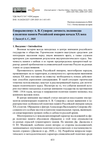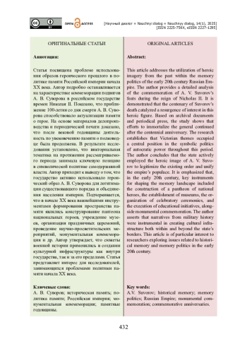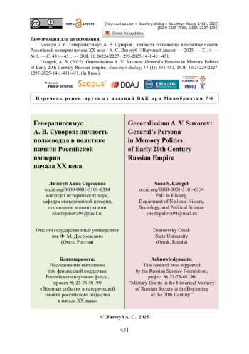 Статья посвящена проблеме использования образов героического прошлого в политике памяти Российской империи начала ХХ века. Автор подробно останавливается на характеристике коммеморации подвигов А. В. Суворова в российском государстве времен Николая II. Показано, что приближение 100-летия со дня смерти А. В. Суворова способствовало актуализации памяти о герое. На основе материалов делопроизводства и периодической печати доказано, что после вековой годовщины деятельность по увековечению памяти о полководце была продолжена. В результате исследования установлено, что викториальная тематика на протяжении рассматриваемого периода занимала ключевую позицию в символической политике самодержавной власти. Автор приходит к выводу о том, что государство активно использовало героический образ А. В. Суворова для легитимации существовавшего порядка и объединения населения империи. Подчеркивается, что в начале ХХ века важнейшими инструментами формирования пространства памяти являлись конструирование пантеона национальных героев, учреждение музеев, организация праздничных церемоний, проведение научно-просветительских мероприятий, монументальная коммеморация и др. Автор утверждает, что сюжеты военной истории применялись в создании культурной инфраструктуры как внутри государства, так и за его пределами. Статья представляет интерес для исследователей, занимающихся проблемами политики памяти начала ХХ века.