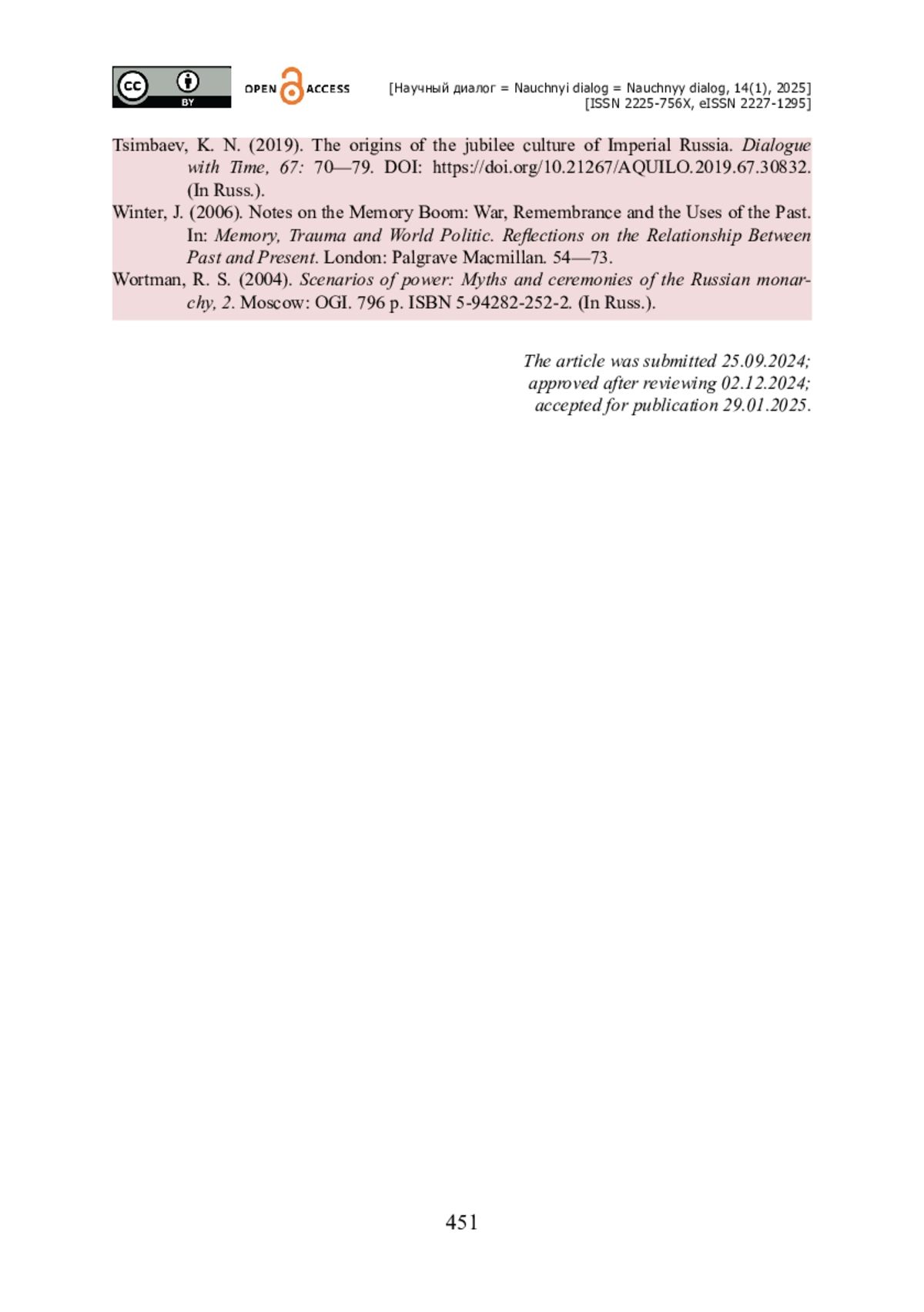 42. Цимбаев К. Н. Истоки юбилейной культуры императорской России / К. Н. Цимбаев // Диалог со временем. - 2019. - № 67. - С. 70-79. - https://doi.org/10.21267/AQUILO.2019.67.30832.