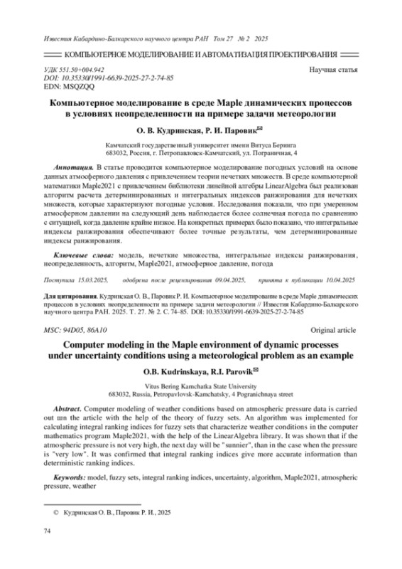 В статье проводится компьютерное моделирование погодных условий на основе данных атмосферного давления с привлечением теории нечетких множеств. В среде компьютерной математики Maple2021 с привлечением библиотеки линейной алгебры LinearAlgebra был реализован алгоритм расчета детерминированных и интегральных индексов ранжирования для нечетких множеств, которые характеризуют погодные условия. Исследования показали, что при умеренном атмосферном давлении на следующий день наблюдается более солнечная погода по сравнению с ситуацией, когда давление крайне низкое. На конкретных примерах было показано, что интегральные индексы ранжирования обеспечивают более точные результаты, чем детерминированные индексы ранжирования.