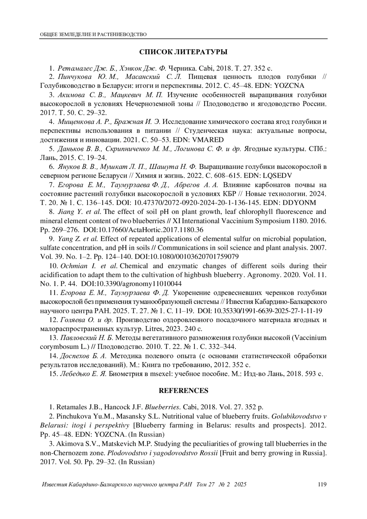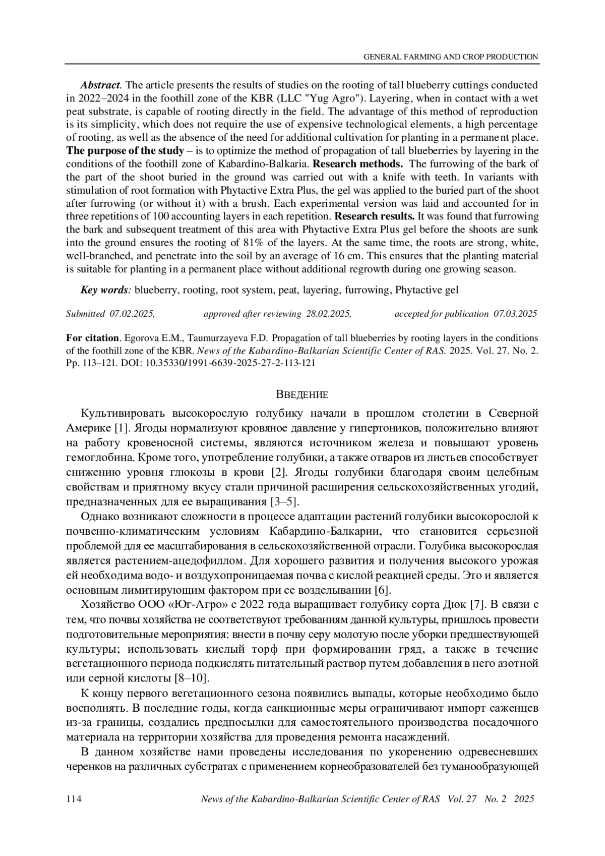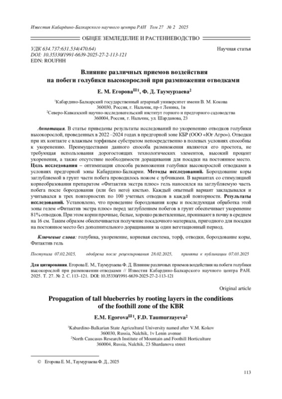 ЕГОРОВА Е. М., ТАУМУРЗАЕВА Ф. Д. ВЛИЯНИЕ РАЗЛИЧНЫХ ПРИЕМОВ ВОЗДЕЙСТВИЯ НА ПОБЕГИ ГОЛУБИКИ ВЫСОКОРОСЛОЙ ПРИ РАЗМНОЖЕНИИ ОТВОДКАМИ // ИЗВЕСТИЯ КАБАРДИНО-БАЛКАРСКОГО НАУЧНОГО ЦЕНТРА РАН. 2025. ТОМ 27 № 2