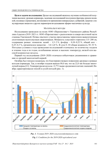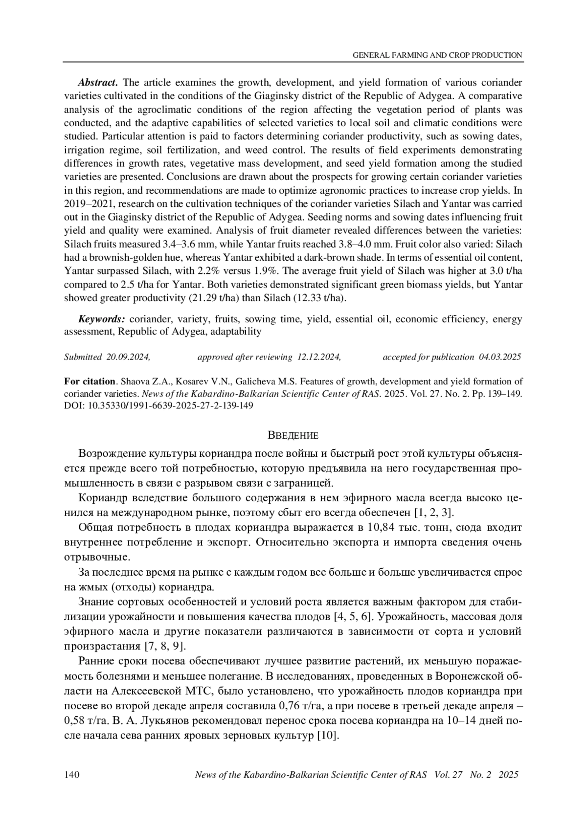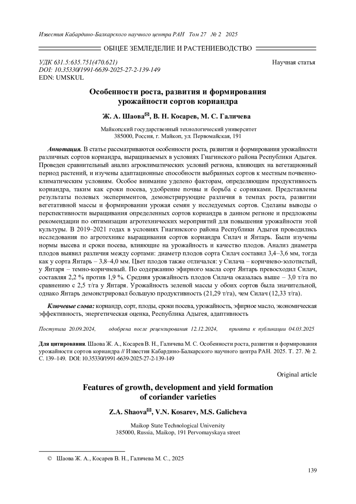 В статье рассматриваются особенности роста, развития и формирования урожайности различных сортов кориандра, выращиваемых в условиях Гиагинского района Республики Адыгея. Проведен сравнительный анализ агроклиматических условий региона, влияющих на вегетационный период растений, и изучены адаптационные способности выбранных сортов к местным почвенно-климатическим условиям. Особое внимание уделено факторам, определяющим продуктивность кориандра, таким как сроки посева, удобрение почвы и борьба с сорняками. Представлены результаты полевых экспериментов, демонстрирующие различия в темпах роста, развитии вегетативной массы и формировании урожая семян у исследуемых сортов. Сделаны выводы о перспективности выращивания определенных сортов кориандра в данном регионе и предложены рекомендации по оптимизации агротехнических мероприятий для повышения урожайности этой культуры. В 2019-2021 годах в условиях Гиагинского района Республики Адыгея проводились исследования по агротехнике выращивания сортов кориандра Силач и Янтарь. Были изучены нормы высева и сроки посева, влияющие на урожайность и качество плодов. Анализ диаметра плодов выявил различия между сортами: диаметр плодов сорта Силач составил 3,4-3,6 мм, тогда как у сорта Янтарь - 3,8-4,0 мм. Цвет плодов также отличался: у Силача - коричнево-золотистый, у Янтаря - темно-коричневый. По содержанию эфирного масла сорт Янтарь превосходил Силач, составляя 2,2 % против 1,9 %. Средняя урожайность плодов Силача оказалась выше - 3,0 т/га по сравнению с 2,5 т/га у Янтаря. Урожайность зеленой массы у обоих сортов была значительной, однако Янтарь демонстрировал большую продуктивность (21,29 т/га), чем Силач (12,33 т/га).