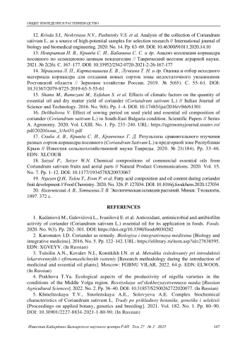 12. 	Krivda S.I., Nevkrytaya N.V., Pashtetsky V.S. et al. Analysis of the collection of Coriandrum sativum L. as a source of high-potential samples for selection research // International journal of biology and biomedical engineering. 2020. No. 14. Pp. 63-69. DOI: 10.46300/91011.2020.14.10 EDN: RCQFVG