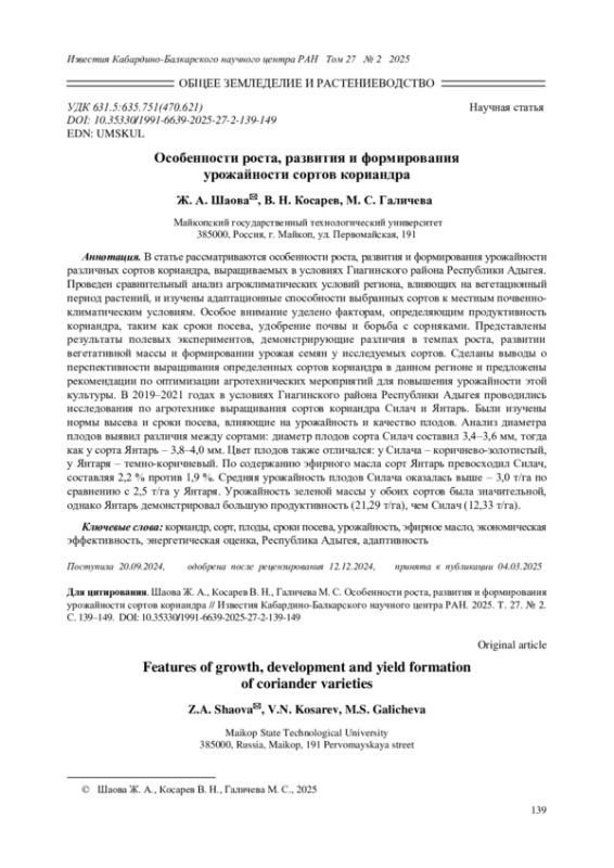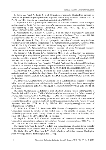 7. 	Степанова Н. Ю. Агробиологическая оценка сортов кориандра в условиях Ленинградской области // Известия Санкт-Петербургского государственного аграрного университета. 2021. № 4(65). С. 20-27. DOI: 10.24412/2078-1318-2021-4-20-27 EDN: ZFIAGN