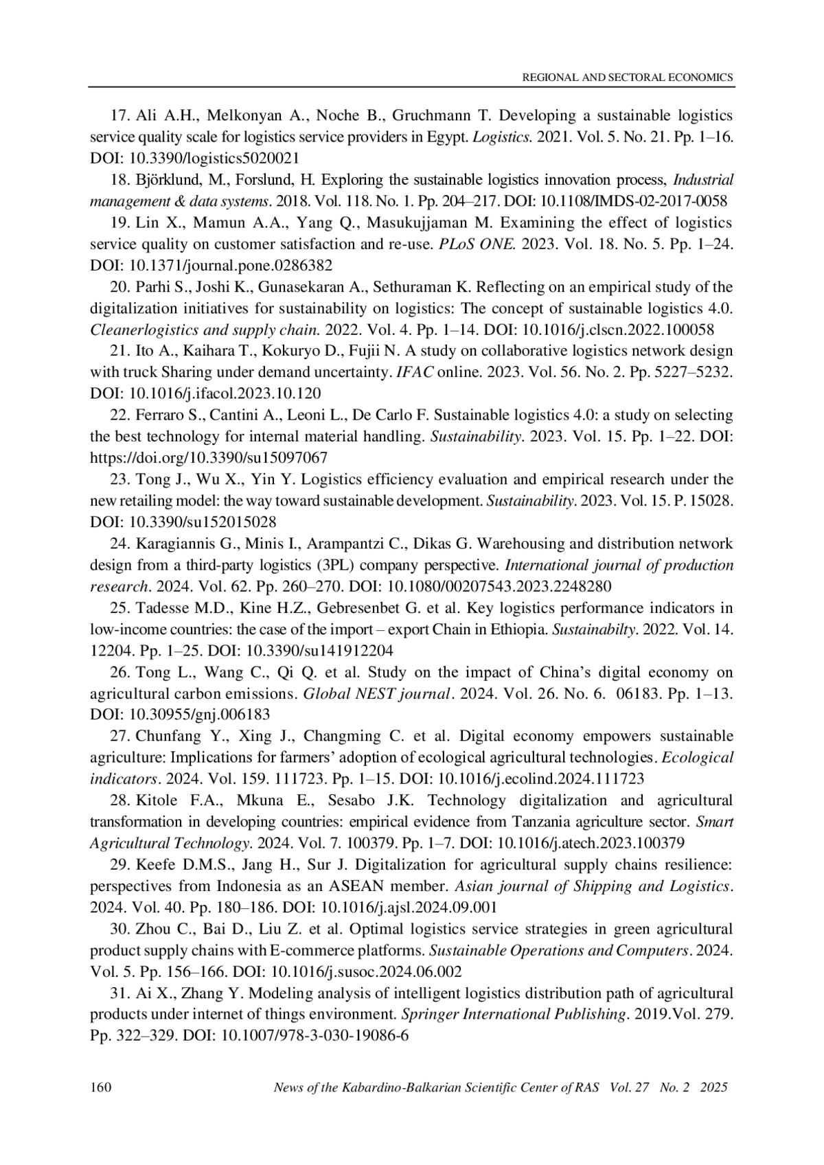 31. 	Ai X., Zhang Y. Modeling analysis of intelligent logistics distribution path of agricultural products under internet of things environment. Springer International Publishing. 2019.Vol. 279. Pp. 322-329. DOI: 10.1007/978-3-030-19086-6