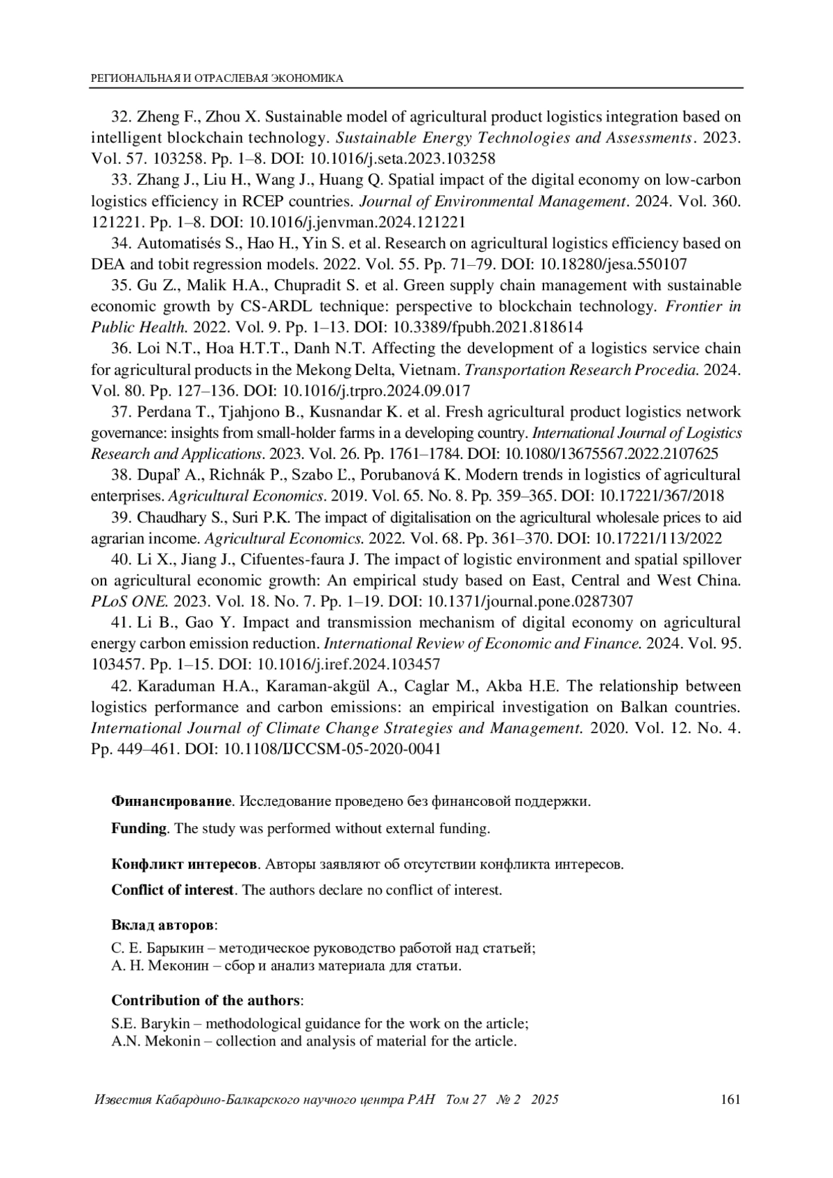 27. 	Chunfang Y., Xing J., Changming C. et al. Digital economy empowers sustainable agriculture: Implications for farmers’ adoption of ecological agricultural technologies. Ecological indicators. 2024. Vol. 159. 111723. Pp. 1-15. DOI: 10.1016/j.ecolind.2024.111723 EDN: HVOKNY