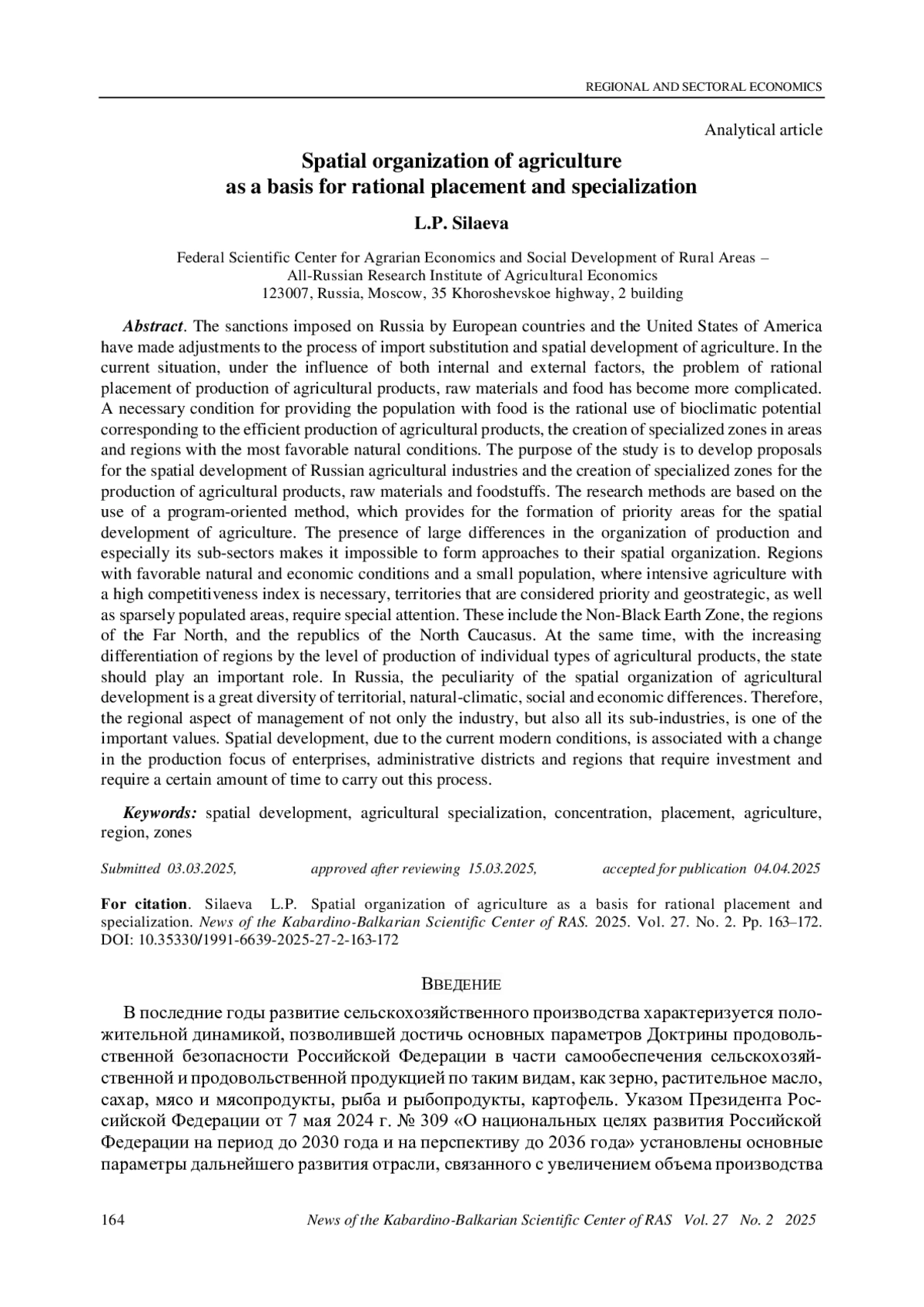 Санкции, введенные против России европейскими странами и Соединенными Штатами Америки, внесли коррективы в процесс импортозамещения и пространственного развития сельского хозяйства. В сложившейся ситуации под воздействием как внутренних, так и внешних факторов, проблема с рациональным размещением производства сельскохозяйственной продукции, сырья и продовольствия осложнилась. Необходимыми условиями обеспечения населения продовольствием являются рациональное использование биоклиматического потенциала, соответствующего эффективному производству продукции сельского хозяйства, создание специализированных зон в ареалах и регионах с наиболее благоприятными природными условиями. Цель исследования - разработка предложений по пространственному развитию отраслей сельского хозяйства России и созданию специализированных зон по производству сельскохозяйственной продукции, сырья и продовольствия. Методы исследования опираются на использование программно-целевого метода, предусматривающего формирование приоритетных направлений по пространственному развитию сельского хозяйства. Наличие больших различий в организации производства и особенно его подотраслей делает невозможным формирование подходов к их пространственной организации. Особого внимания требуют регионы с благоприятными природно-экономическими условиями и с небольшой численностью населения, где необходимо ведение интенсивного сельского хозяйства с высоким показателем конкурентоспособности, территории, относящиеся к приоритетным и геостратегическим, а также слабозаселенные. К ним относятся Нечерноземная зона, районы Крайнего Севера, республики Северного Кавказа. При этом с усилением дифференциации регионов по уровню производства отдельных видов продукции сельского хозяйства важную роль должно играть государство. В России особенностью пространственной организации развития сельского хозяйства является большое разнообразие территориальных, природно-климатических, социальных и экономических различий. Поэтому региональный аспект ведения не только отрасли, но и всех ее подотраслей, имеет одно из важных значений. Пространственное развитие в силу сложившихся современных условий связано с изменением производственной направленности предприятий, административных районов и регионов, нуждающихся в поступлении инвестиций и требующих определенного времени для осуществления данного процесса.