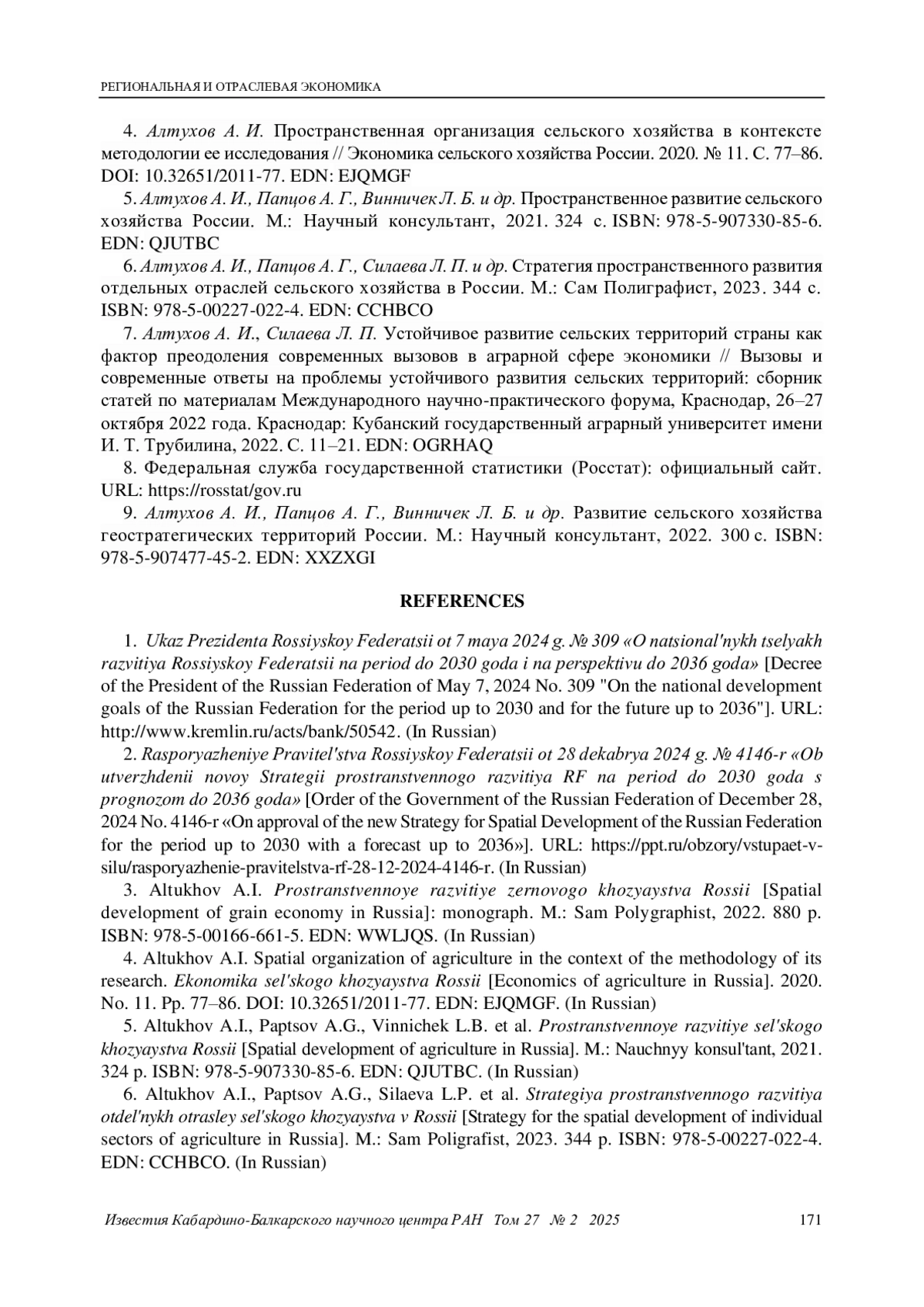 5. Алтухов А. И., Папцов А. Г., Винничек Л. Б. и др. Пространственное развитие сельского хозяйства России. М.: Научный консультант, 2021. 324 с. ISBN: 978-5-907330-85-6 EDN: QJUTBC