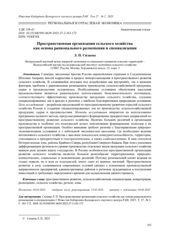 4. Алтухов А. И. Пространственная организация сельского хозяйства в контексте методологии ее исследования // Экономика сельского хозяйства России. 2020. № 11. С. 77-86. DOI: 10.32651/2011-77 EDN: EJQMGF