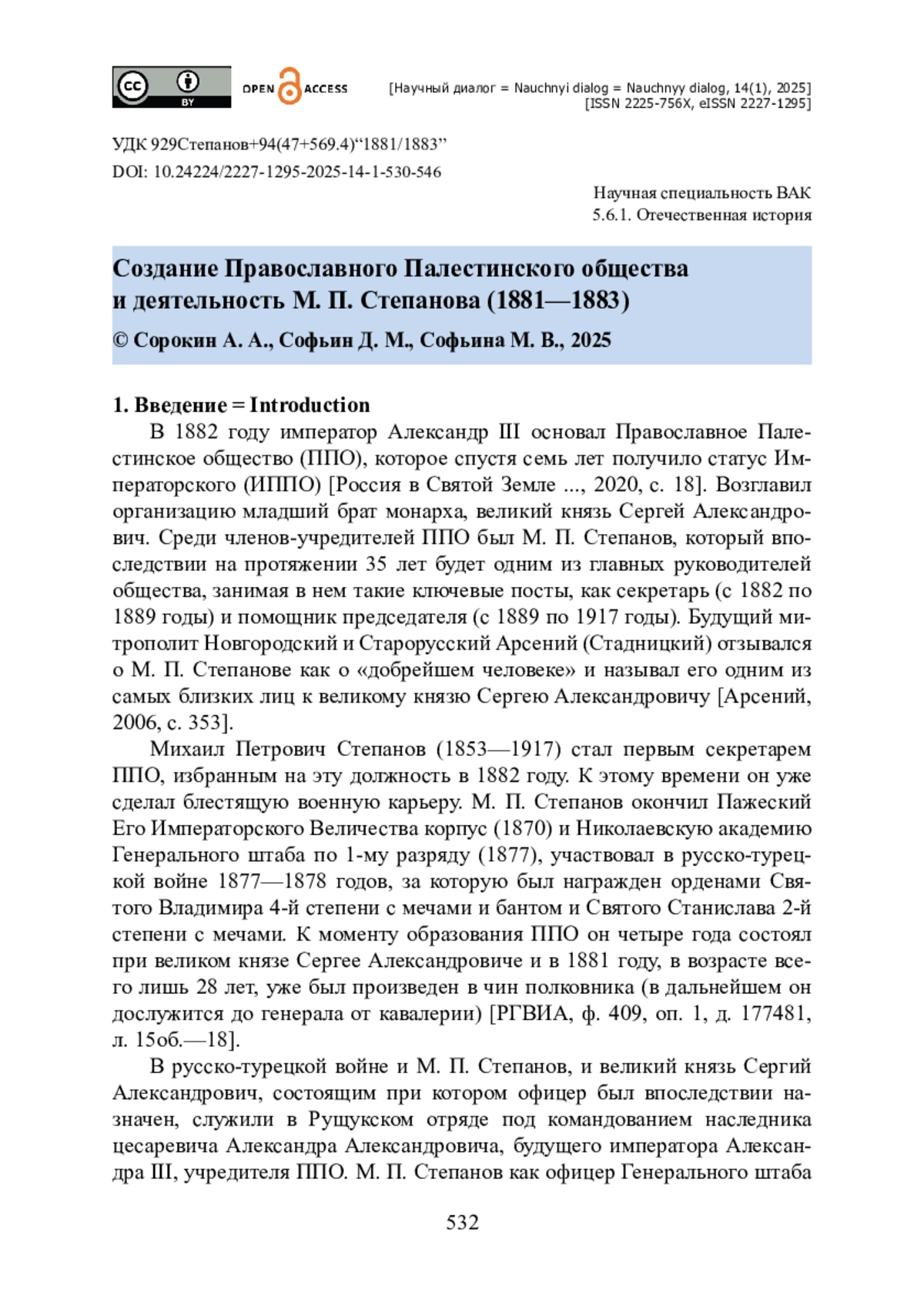 Статья посвящена участию в становлении Православного Палестинского общества, состоящего при великом князе Сергее Александровиче офицера Генерального штаба Михаила Петровича Степанова, который впоследствии был одним из ключевых руководителей общества в течение первых 35 лет существования организации. На основе как опубликованных материалов, так и документов, отложившихся в фондах Архива внешней политики Российской Империи (Москва), Российского государственного военно-исторического архива (Москва) и отдела рукописей Российской национальной библиотеки (Санкт-Петербург), показана роль М. П. Степанова в создании и первых шагах Палестинского общества. Рассматриваются обстоятельства назначения М. П. Степанова состоящим при великом князе и особенности его служебной деятельности. Особое внимание уделяется участию М. П. Степанова в паломнической поездке великого князя на Святую Землю в 1881 году, контактам М. П. Степанова с начальником Русской духовной миссии в Иерусалиме архимандритом Антонином (Капустиным), процессу подготовки к учреждению в 1882 году Палестинского общества. Рассматриваются причины и обстоятельства назначения М. П. Степанова секретарем общества в контексте кадровой политики организации, учитывавшей баланс различных сил, сторон и влияний.