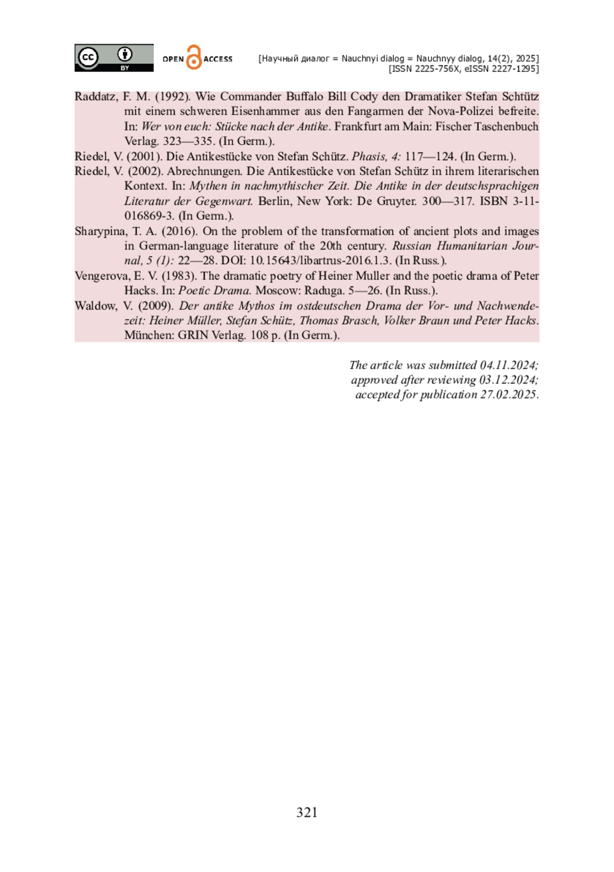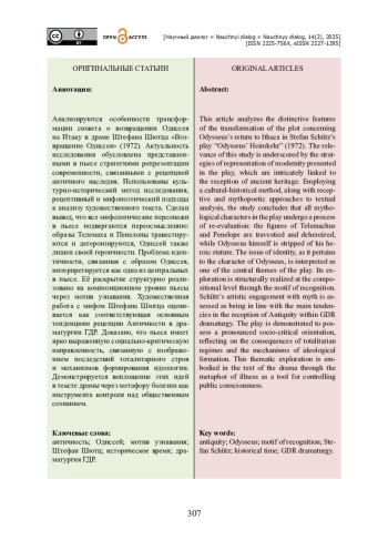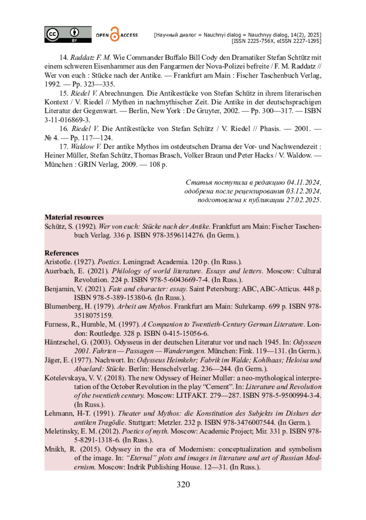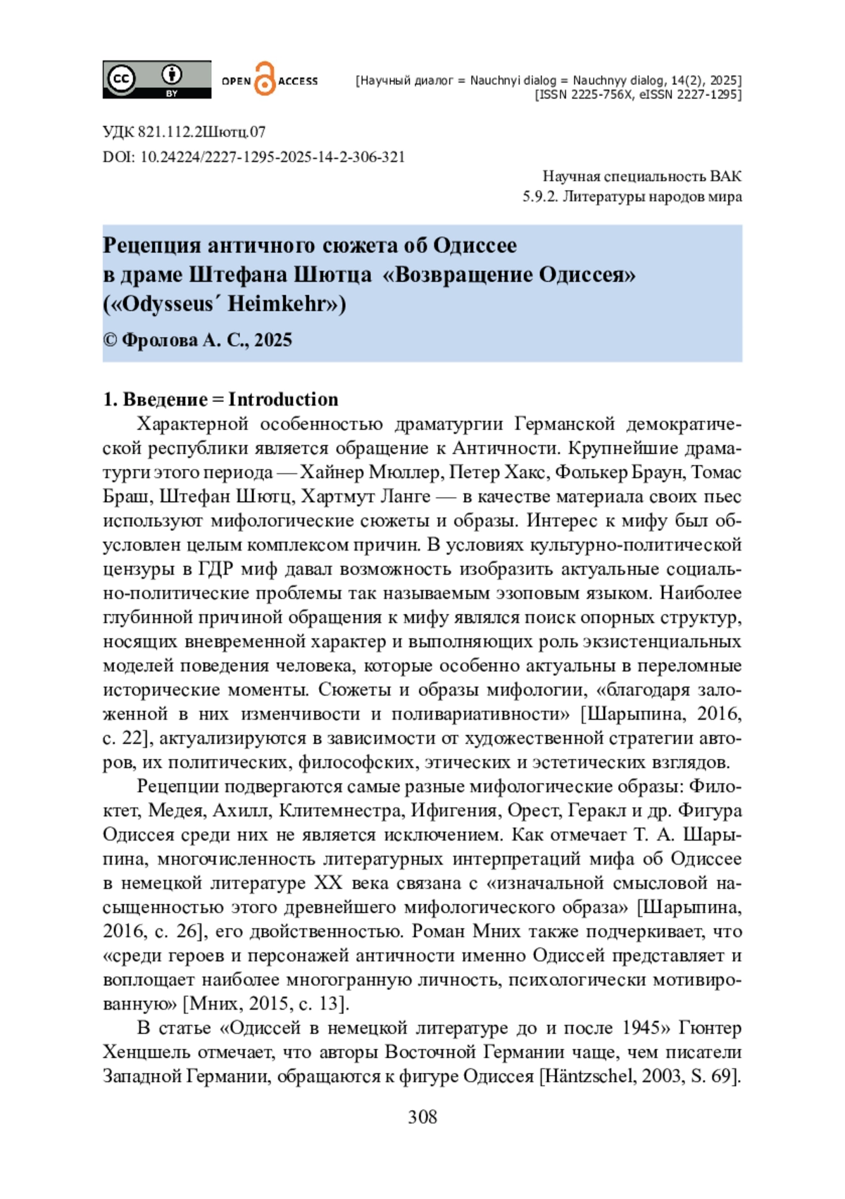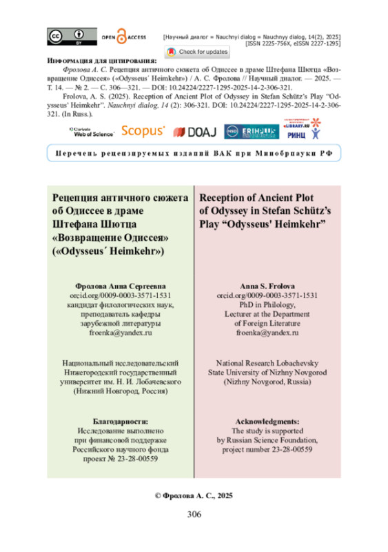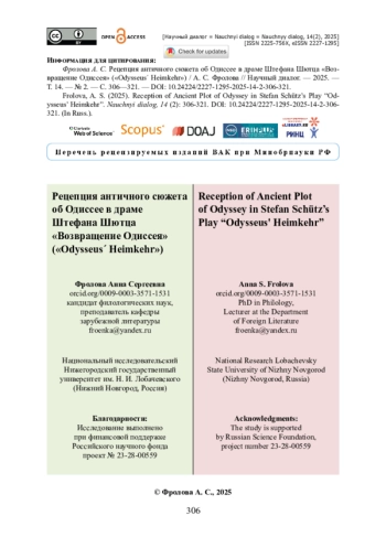 ФРОЛОВА А. С. РЕЦЕПЦИЯ АНТИЧНОГО СЮЖЕТА ОБ ОДИССЕЕ В ДРАМЕ ШТЕФАНА ШЮТЦА «ВОЗВРАЩЕНИЕ ОДИССЕЯ» («ODYSSEUS´ HEIMKEHR») // НАУЧНЫЙ ДИАЛОГ. 2025. ТОМ 14, № 2