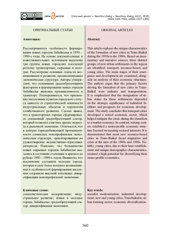Рассматриваются особенности формирования новых городов Забайкалья в 1950— 1980-е годы. На основе документальных и повествовательных источников выделены три группы новых городских поселений региона: транспортные, сырьевые и молодые. Рассмотрены основные этапы их возникновения и развития, проанализирована экономическая структура. Авторы утверждают, что основными градообразующими факторами в формировании новых городов Забайкалья являлись промышленность и транспорт. Подчеркивается, что присвоение населенным пунктам городского статуса зависело от стратегической значимости индустриальных объектов и перспектив хозяйственного развития. Сделан вывод, что в транспортных городах сформировался смешанный градообразующий сектор, который позволил смягчить кризис перехода к рыночной экономике. Отмечается, что в центрах горнодобывающей промышленности сложилась монопрофильная экономическая структура, ориентированная на удовлетворение ведомственно-отраслевых интересов. Показано, что большинство новых сырьевых городов Забайкалья оказались в состоянии стагнации и кризиса на рубеже 1980—1990-х годов. Выявлено, что исключение составили молодые города, которые в силу более позднего возникновения и особенностей формирования населения сохранили высокий потенциал диверсификации монопрофильной экономики.