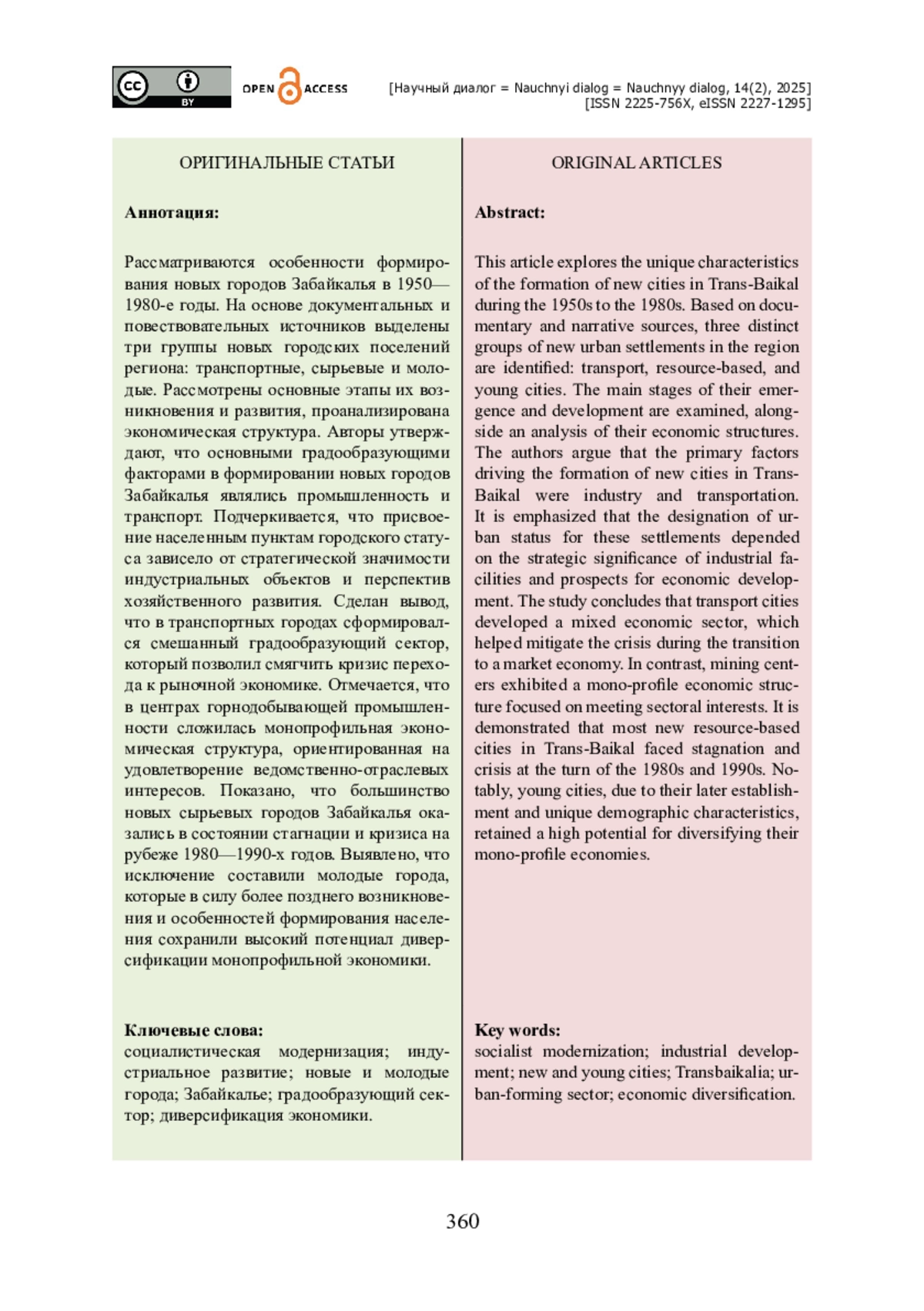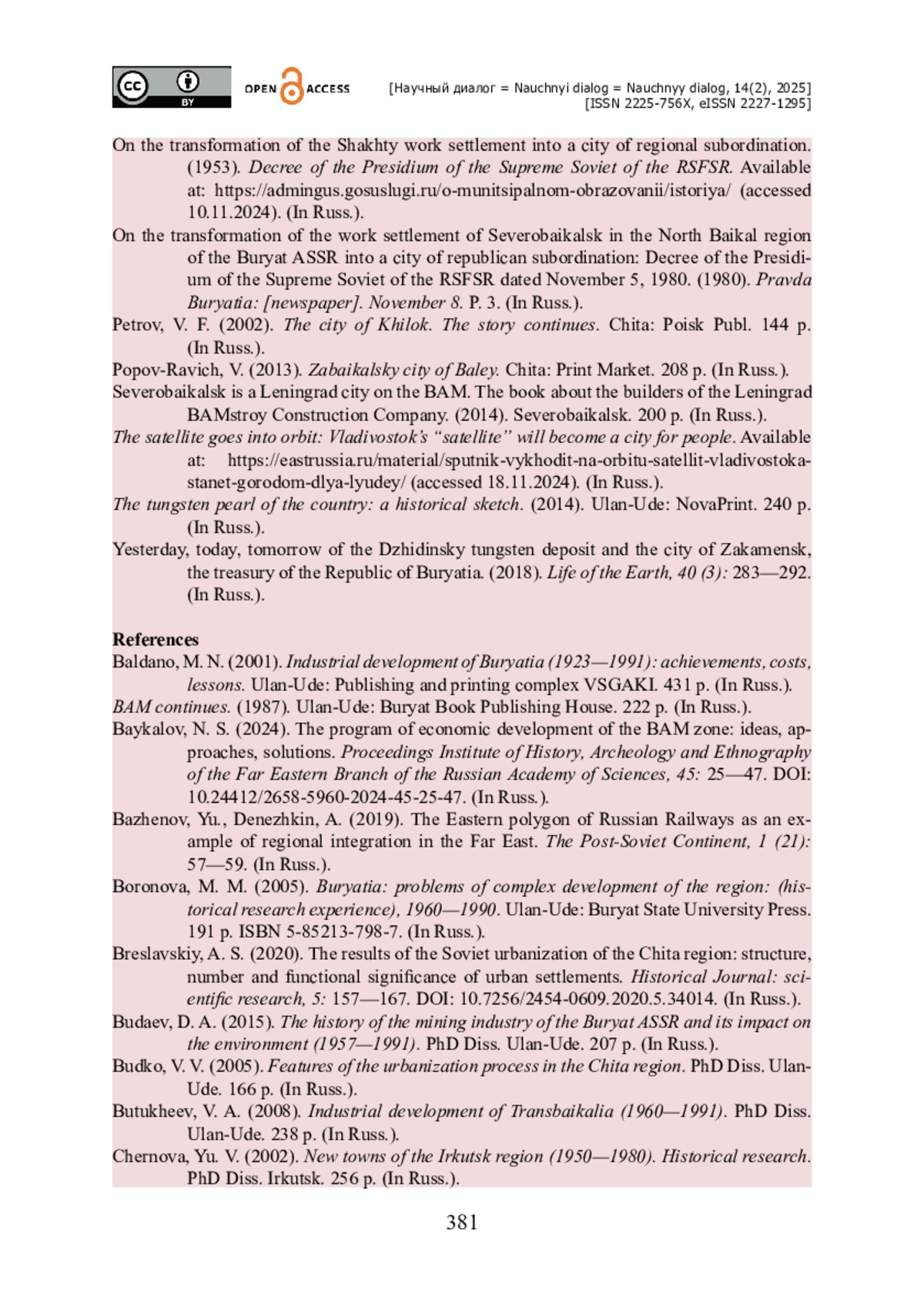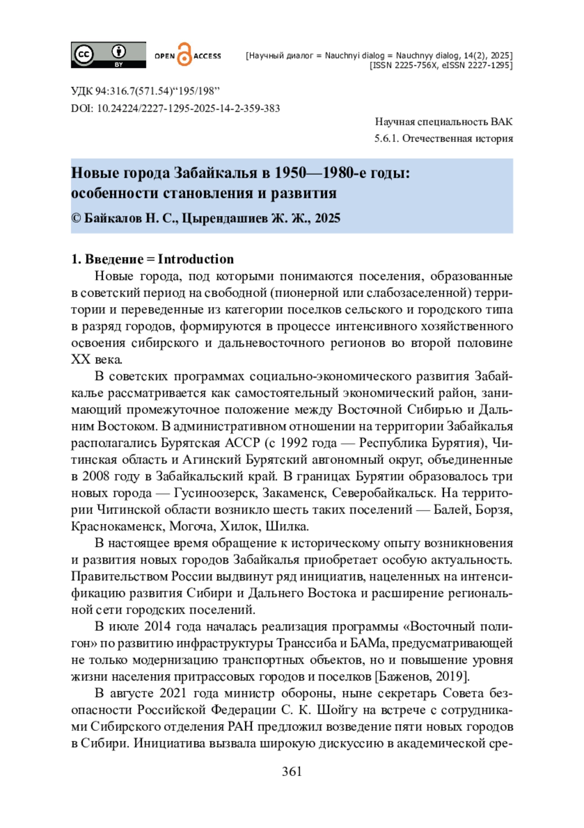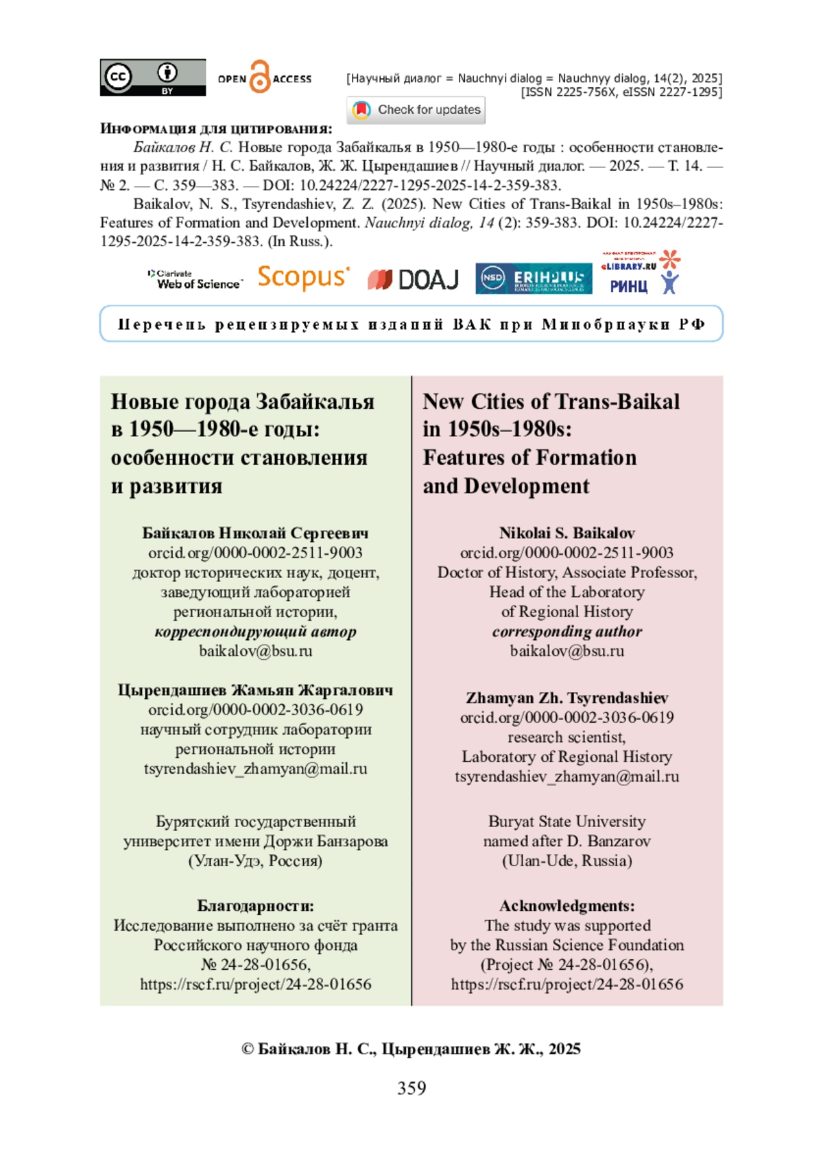 БАЙКАЛОВ Н. С., ЦЫРЕНДАШИЕВ Ж. Ж. НОВЫЕ ГОРОДА ЗАБАЙКАЛЬЯ В 1950—1980-Е ГОДЫ: ОСОБЕННОСТИ СТАНОВЛЕНИЯ И РАЗВИТИЯ // НАУЧНЫЙ ДИАЛОГ. 2025. ТОМ 14, № 2