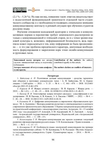 1. Байкулова А. Н. Позитивная деловая коммуникация : средства гармонизации общения в групповых коммерческих чатах / А. Н. Байкулова, М. А. Кормилицына // СибСкрипт. - 2023. - Т. 25. - № 4. - С. 461-470. - https://doi.org/10.21603/sibscript-2023-25-4-461-470.