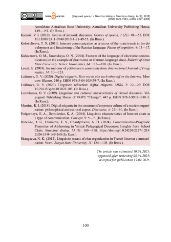 8. Лукинова О. В. Языковая рефлексия: цифровой этикет / О. В. Лукинова // МИРС. - 2023. - № 3. - С. 22-29. - https://doi.org/10.21638/spbu30.2023.303.