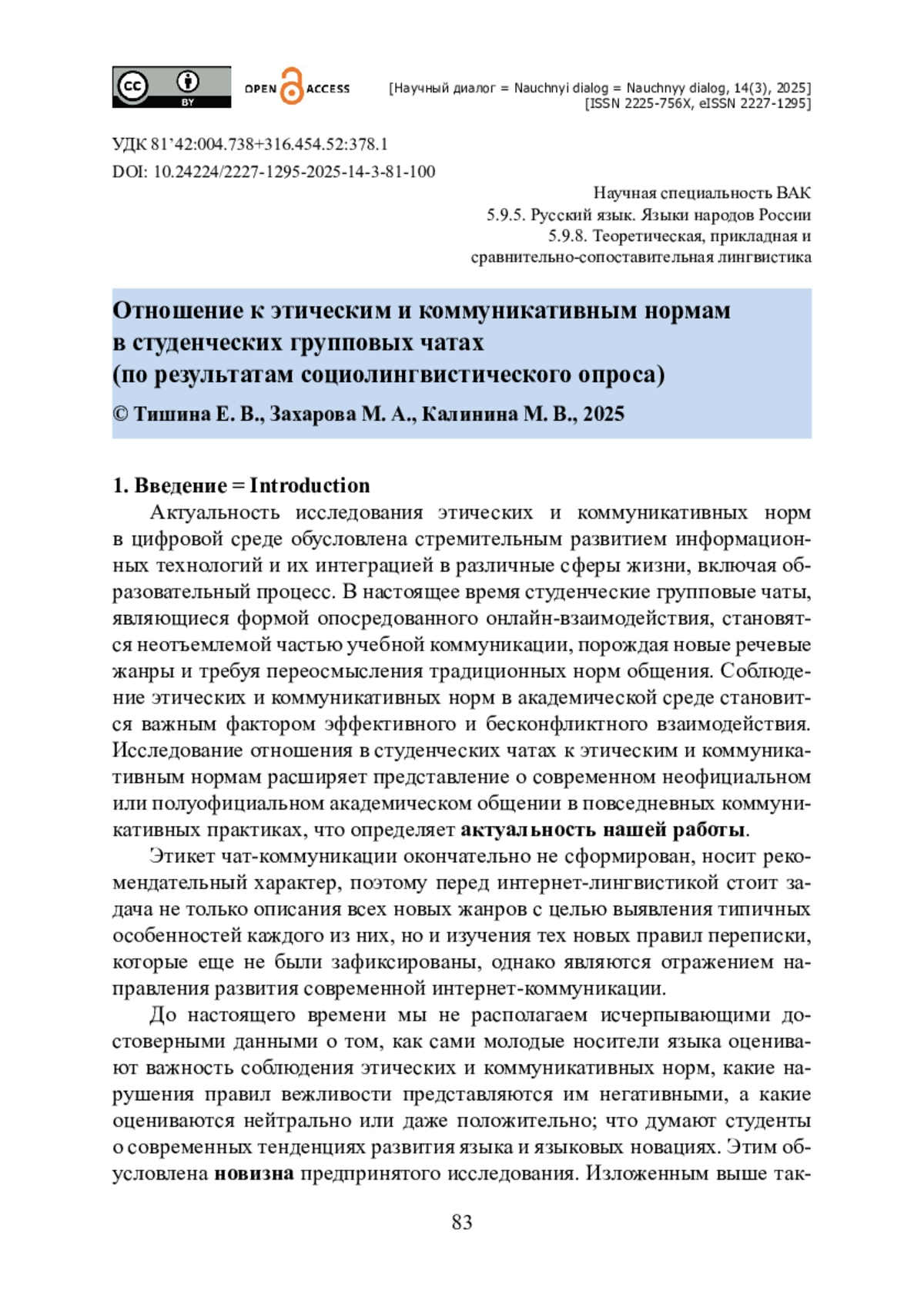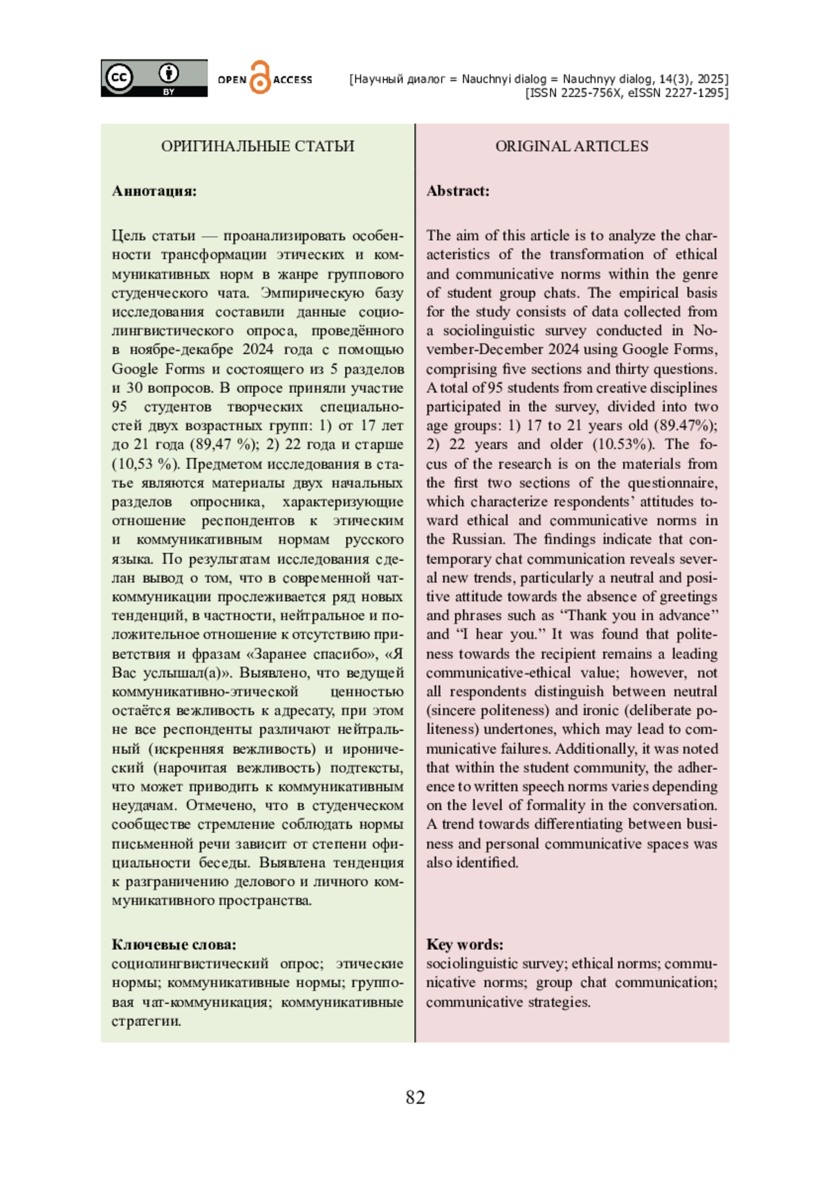 Цель статьи — проанализировать особенности трансформации этических и коммуникативных норм в жанре группового студенческого чата. Эмпирическую базу исследования составили данные социолингвистического опроса, проведённого в ноябре-декабре 2024 года с помощью Google Forms и состоящего из 5 разделов и 30 вопросов. В опросе приняли участие 95 студентов творческих специальностей двух возрастных групп: 1) от 17 лет до 21 года (89,47 %); 2) 22 года и старше (10,53 %). Предметом исследования в статье являются материалы двух начальных разделов опросника, характеризующие отношение респондентов к этическим и коммуникативным нормам русского языка. По результатам исследования сделан вывод о том, что в современной чат-коммуникации прослеживается ряд новых тенденций, в частности, нейтральное и положительное отношение к отсутствию приветствия и фразам «Заранее спасибо», «Я Вас услышал(а)». Выявлено, что ведущей коммуникативно-этической ценностью остаётся вежливость к адресату, при этом не все респонденты различают нейтральный (искренняя вежливость) и иронический (нарочитая вежливость) подтексты, что может приводить к коммуникативным неудачам. Отмечено, что в студенческом сообществе стремление соблюдать нормы письменной речи зависит от степени официальности беседы. Выявлена тенденция к разграничению делового и личного коммуникативного пространства.