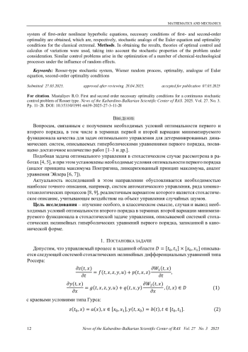 МАСТАЛИЕВ Р. О. НЕОБХОДИМЫЕ УСЛОВИЯ ОПТИМАЛЬНОСТИ ПЕРВОГО И ВТОРОГО ПОРЯДКОВ ДЛЯ НЕПРЕРЫВНОЙ СТОХАСТИЧЕСКОЙ ЗАДАЧИ УПРАВЛЕНИЯ ТИПА РОССЕРА // ИЗВЕСТИЯ КАБАРДИНО-БАЛКАРСКОГО НАУЧНОГО ЦЕНТРА РАН. 2025. ТОМ 27 № 3