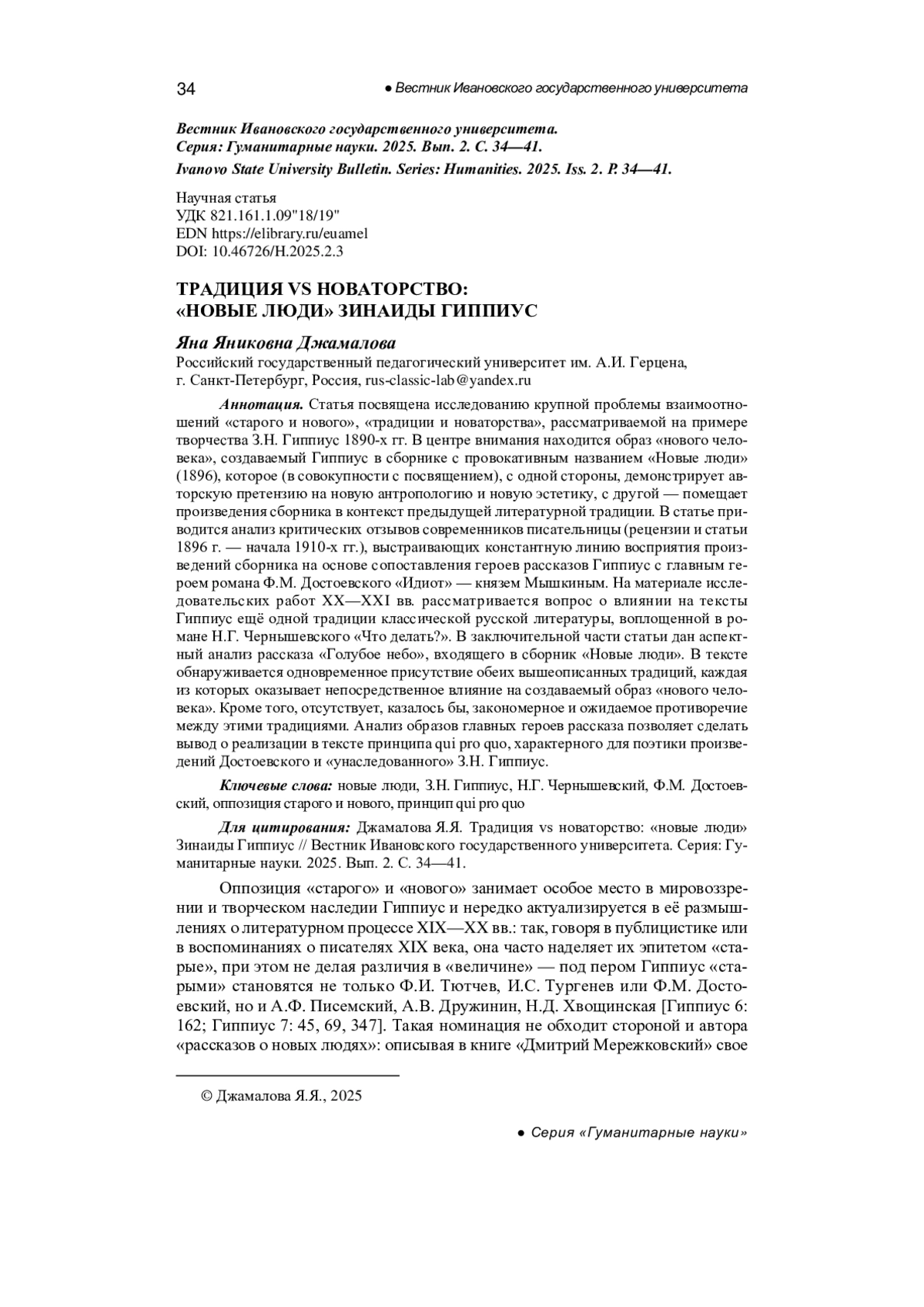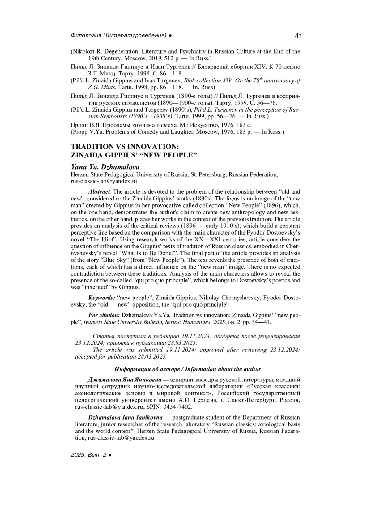Magomedova D. M. Rewriting the “New People” Plot in the Russian Fiction at the End of the 19th and the Beginning of the 20th Centuries (V.V. Veresayev and Z.N. Gippius), Novyi filologicheskii Vestnik, 2018, no. 2, vol. 45, pp. 118-127. - In Russ.