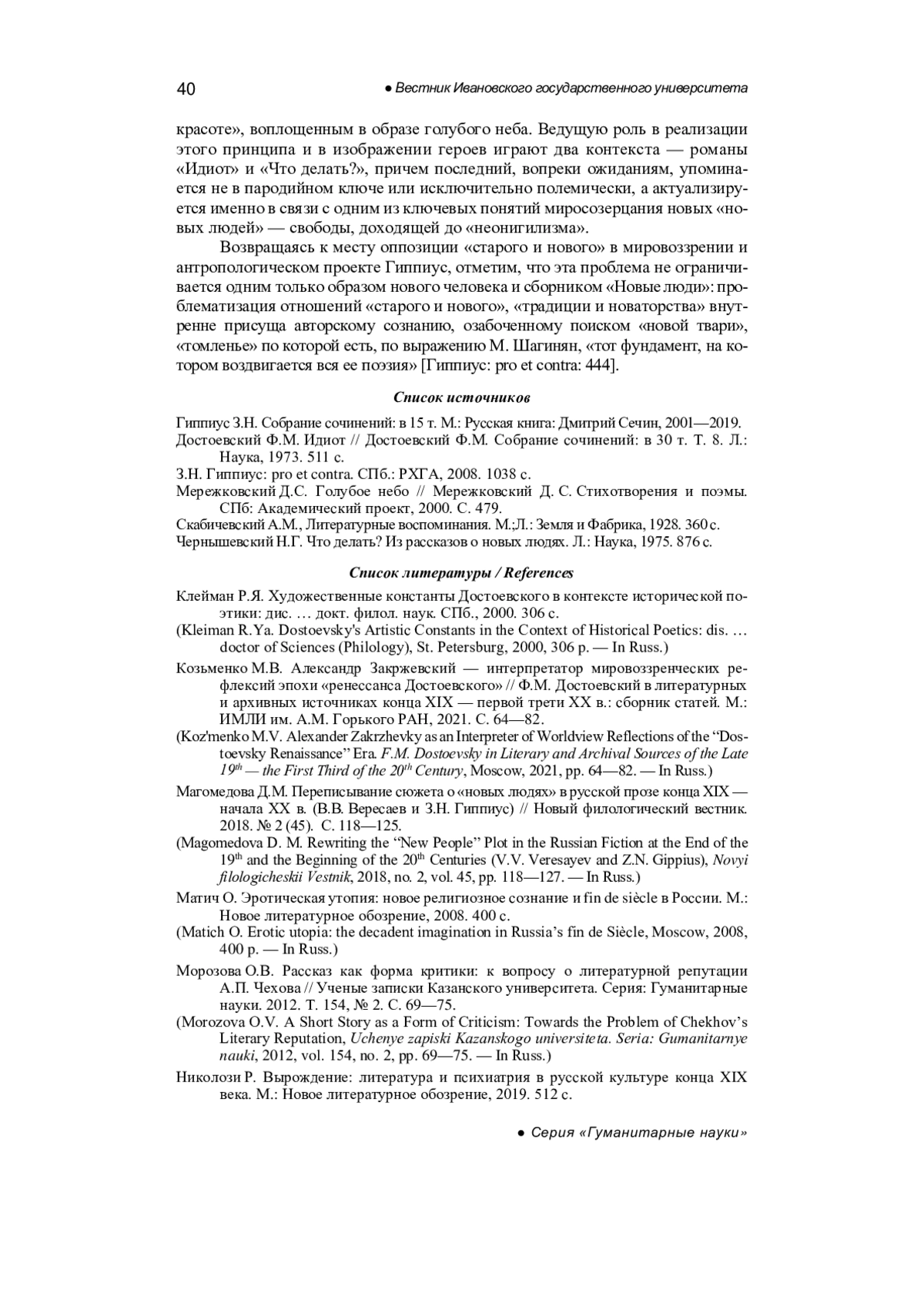 Koz’menko M.V. Alexander Zakrzhevky as an Interpreter of Worldview Reflections of the “Dostoevsky Renaissance” Era. F.M. Dostoevsky in Literary and Archival Sources of the Late 19th - the First Third of the 20th Century, Moscow, 2021, pp. 64-82. - In Russ. EDN: LPPPXQ
