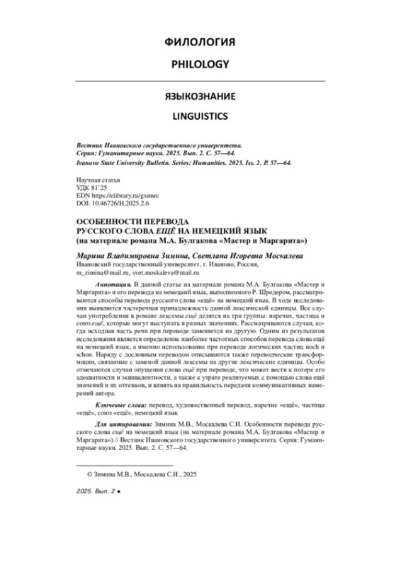 ЗИМИНА М. В., МОСКАЛЕВА С. И. ОСОБЕННОСТИ ПЕРЕВОДА РУССКОГО СЛОВА ЕЩЁ НА НЕМЕЦКИЙ ЯЗЫК (НА МАТЕРИАЛЕ РОМАНА М. А. БУЛГАКОВА «МАСТЕР И МАРГАРИТА») // ВЕСТНИК ИВАНОВСКОГО ГОСУДАРСТВЕННОГО УНИВЕРСИТЕТА. СЕРИЯ: ГУМАНИТАРНЫЕ НАУКИ. 2025. № 2