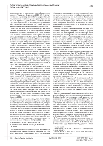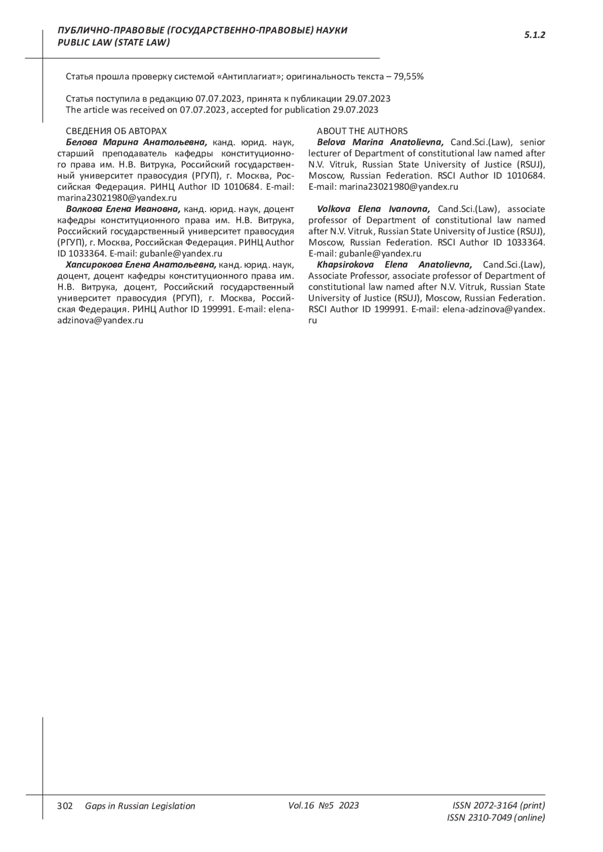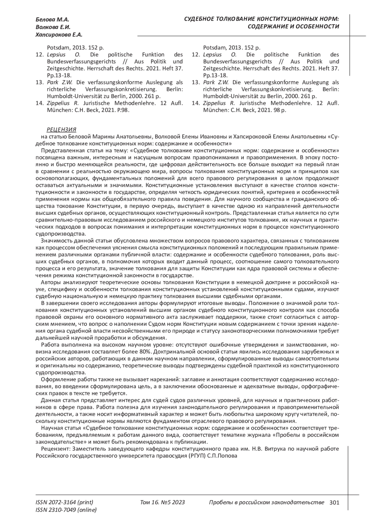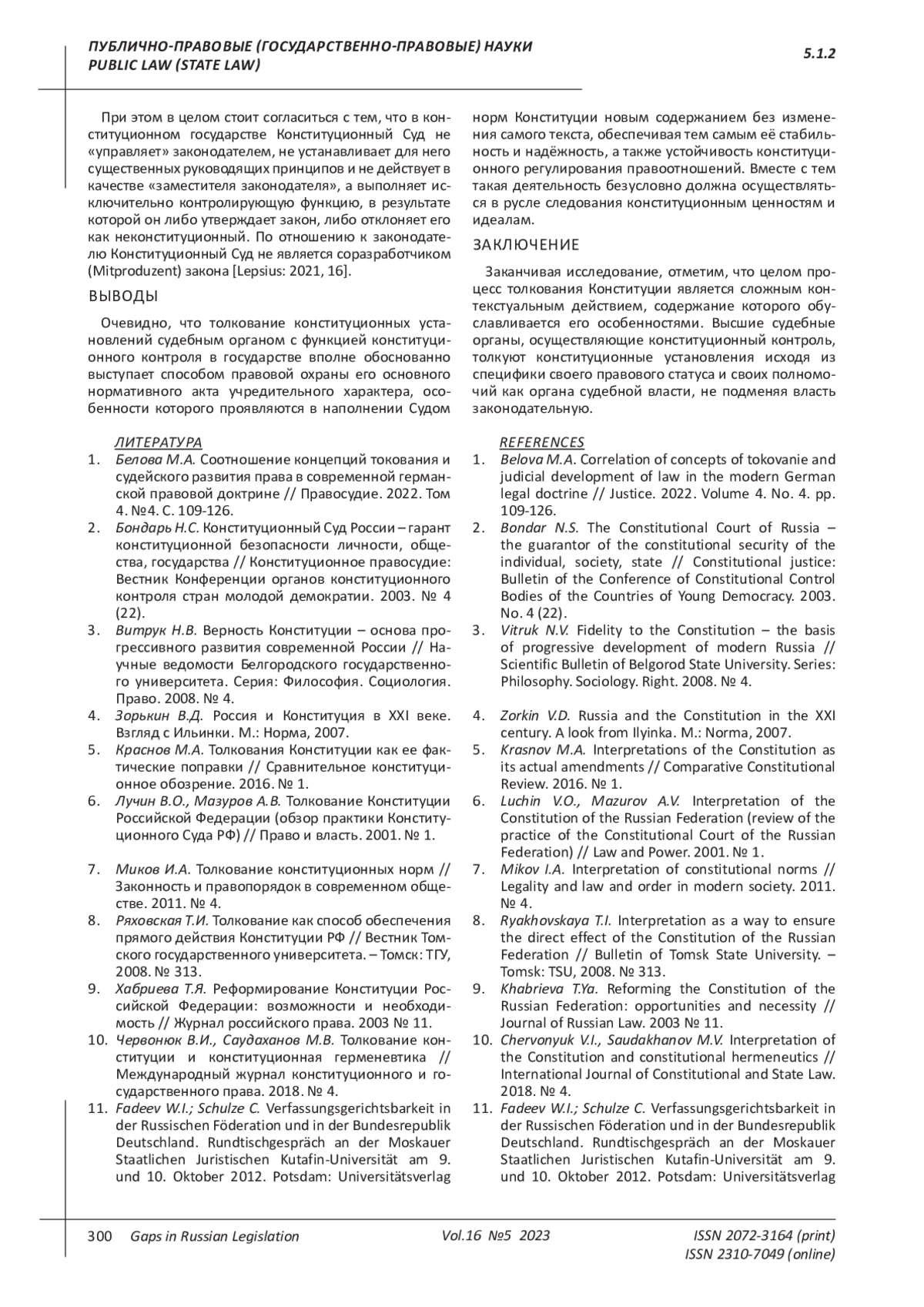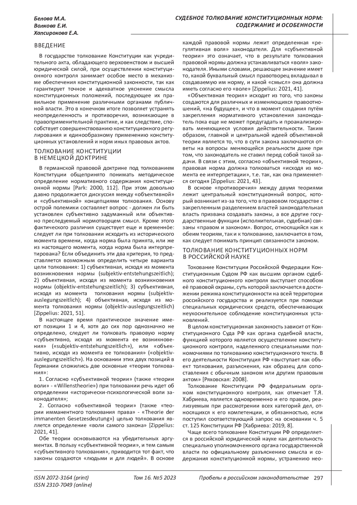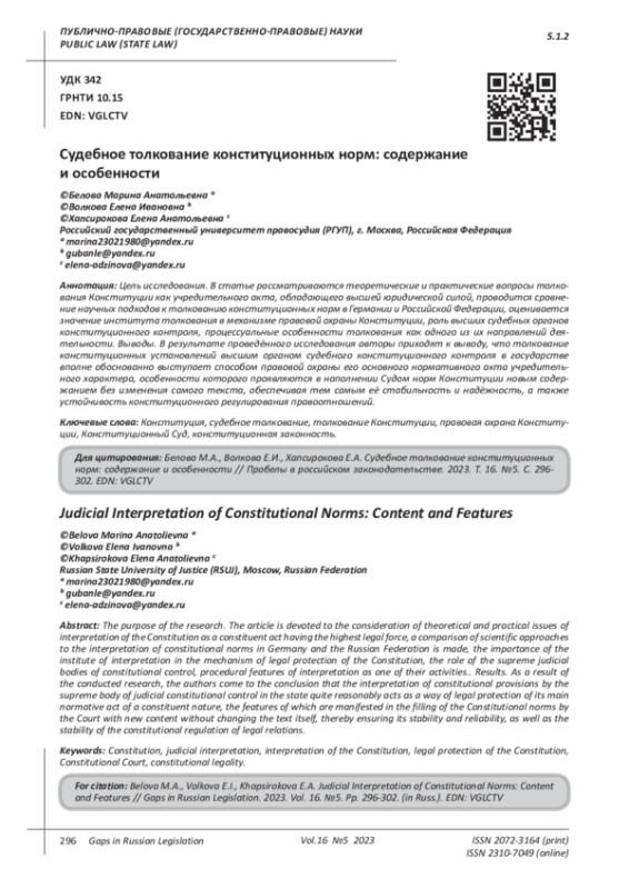 ВОЛКОВА Е. И., БЕЛОВА М. А., ХАПСИРОКОВА Е. А. СУДЕБНОЕ ТОЛКОВАНИЕ КОНСТИТУЦИОННЫХ НОРМ: СОДЕРЖАНИЕ И ОСОБЕННОСТИ // ПРОБЕЛЫ В РОССИЙСКОМ ЗАКОНОДАТЕЛЬСТВЕ. 2023. Т. 16 № 5