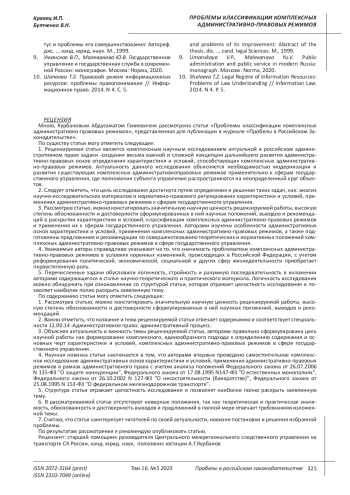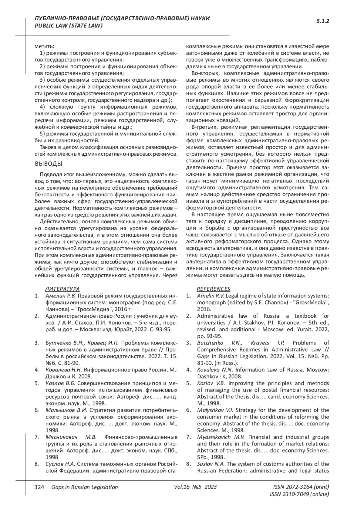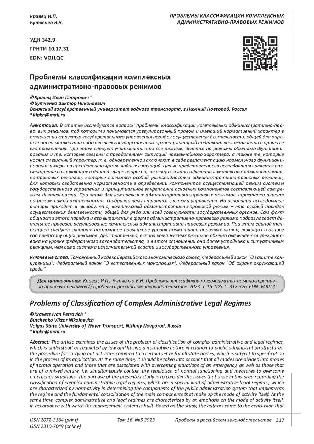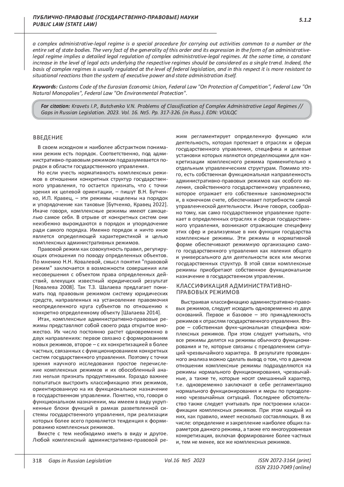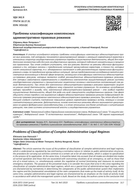 КРАВЕЦ И. П., БУТЧЕНКО В. Н. ПРОБЛЕМЫ КЛАССИФИКАЦИИ КОМПЛЕКСНЫХ АДМИНИСТРАТИВНО-ПРАВОВЫХ РЕЖИМОВ // ПРОБЕЛЫ В РОССИЙСКОМ ЗАКОНОДАТЕЛЬСТВЕ. 2023. Т. 16 № 5