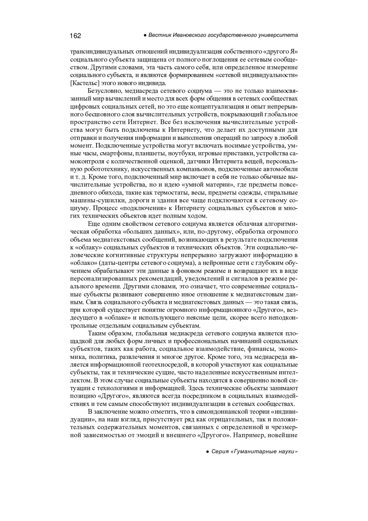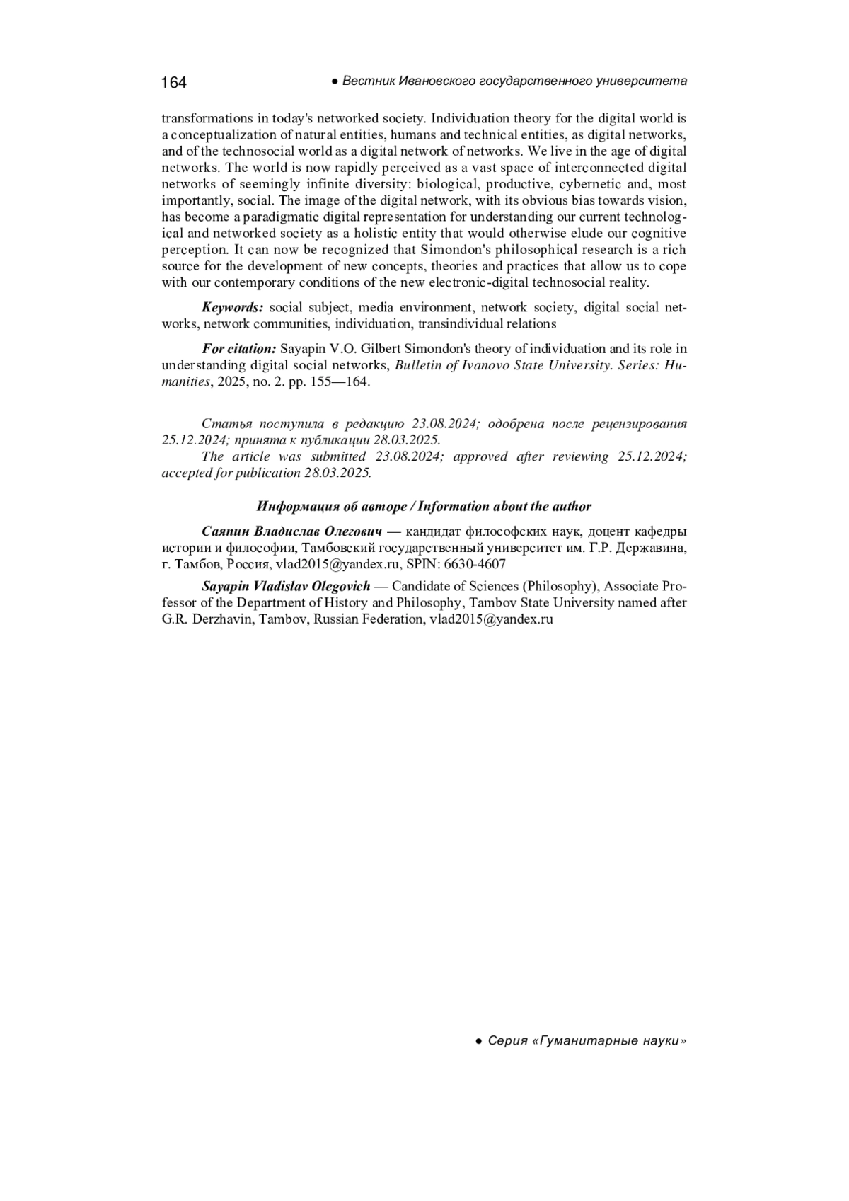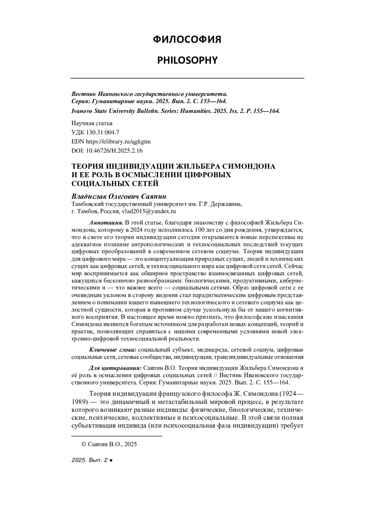 САЯПИН В. О. ТЕОРИЯ ИНДИВИДУАЦИИ ЖИЛЬБЕРА СИМОНДОНА И ЕЕ РОЛЬ В ОСМЫСЛЕНИИ ЦИФРОВЫХ СОЦИАЛЬНЫХ СЕТЕЙ // ВЕСТНИК ИВАНОВСКОГО ГОСУДАРСТВЕННОГО УНИВЕРСИТЕТА. СЕРИЯ: ГУМАНИТАРНЫЕ НАУКИ. 2025. № 2