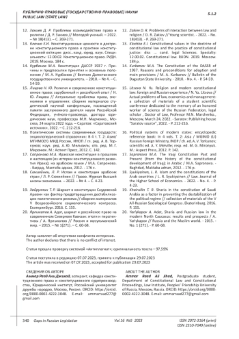 18. Сюкияйнен, Л. Р. Ислам и конституции арабских стран / Л. Р. Сюкияйнен // Право. Журнал Высшей школы экономики. - 2022. - № 4. - С. 4-23. EDN: PFWGSE