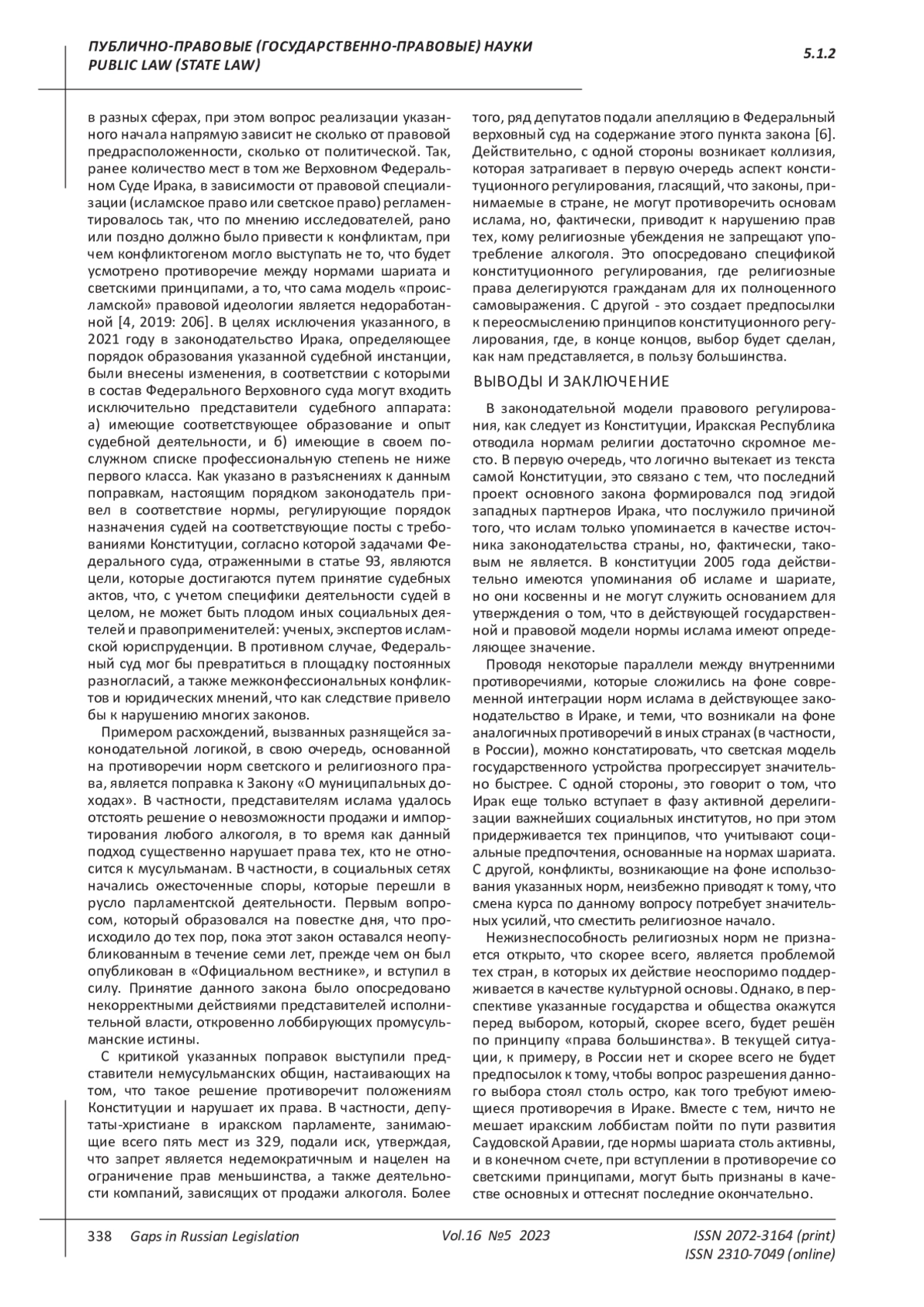 В законодательной модели правового регулирования, как следует из Конституции, Иракская Республика отводила нормам религии достаточно скромное место. В первую очередь, что логично вытекает из текста самой Конституции, это связано с тем, что последний проект основного закона формировался под эгидой западных партнеров Ирака, что послужило причиной того, что ислам только упоминается в качестве источника законодательства страны, но, фактически, таковым не является. В конституции 2005 года действительно имеются упоминания об исламе и шариате, но они косвенны и не могут служить основанием для утверждения о том, что в действующей государственной и правовой модели нормы ислама имеют определяющее значение. Проводя некоторые параллели между внутренними противоречиями, которые сложились на фоне современной интеграции норм ислама в действующее законодательство в Ираке, и теми, что возникали на фоне аналогичных противоречий в иных странах (в частности, в России), можно констатировать, что светская модель государственного устройства прогрессирует значительно быстрее. С одной стороны, это говорит о том, что Ирак еще только вступает в фазу активной дерелигизации важнейших социальных институтов, но при этом придерживается тех принципов, что учитывают социальные предпочтения, основанные на нормах шариата. С другой, конфликты, возникающие на фоне использования указанных норм, неизбежно приводят к тому, что смена курса по данному вопросу потребует значительных усилий, что сместить религиозное начало.
