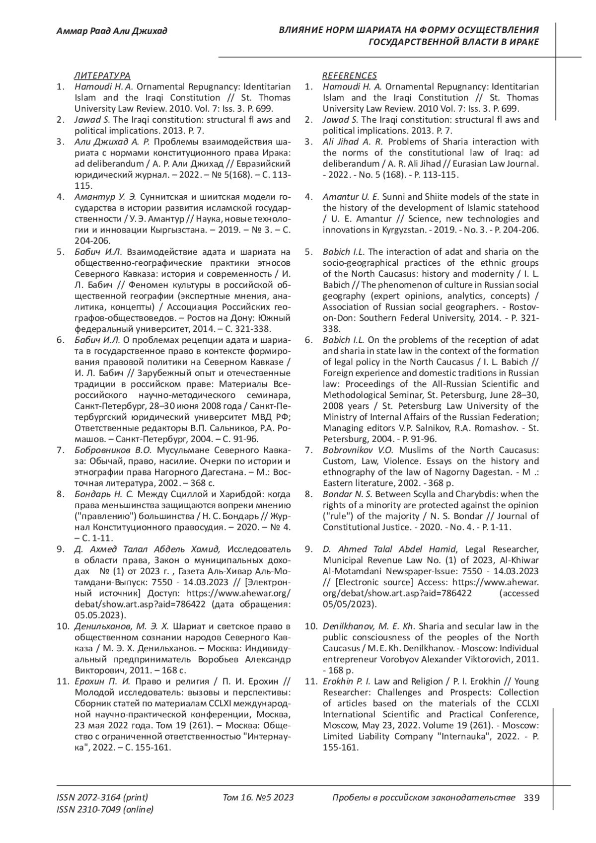 1. Hamoudi H. A. Ornamental Repugnancy: Identitarian Islam and the Iraqi Constitution // St. Thomas University Law Review. 2010 Vol. 7: Iss. 3. P. 699.