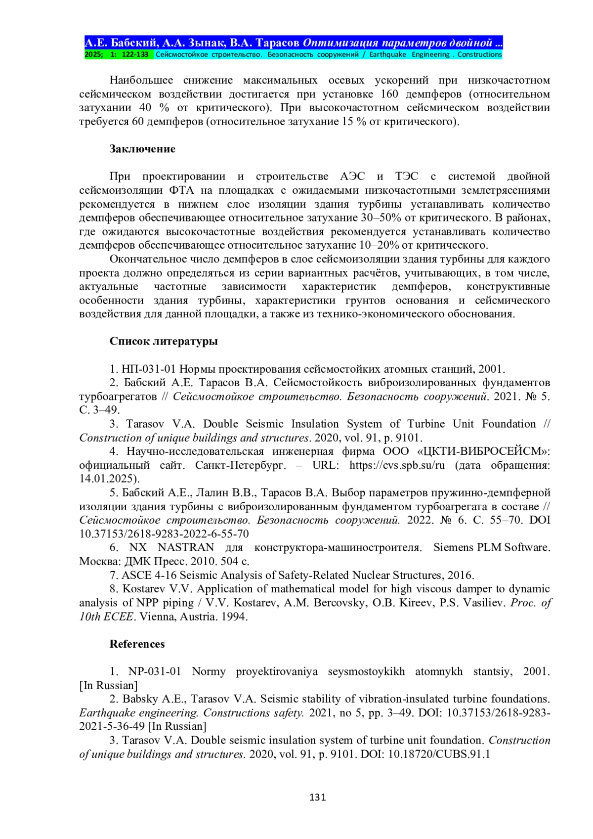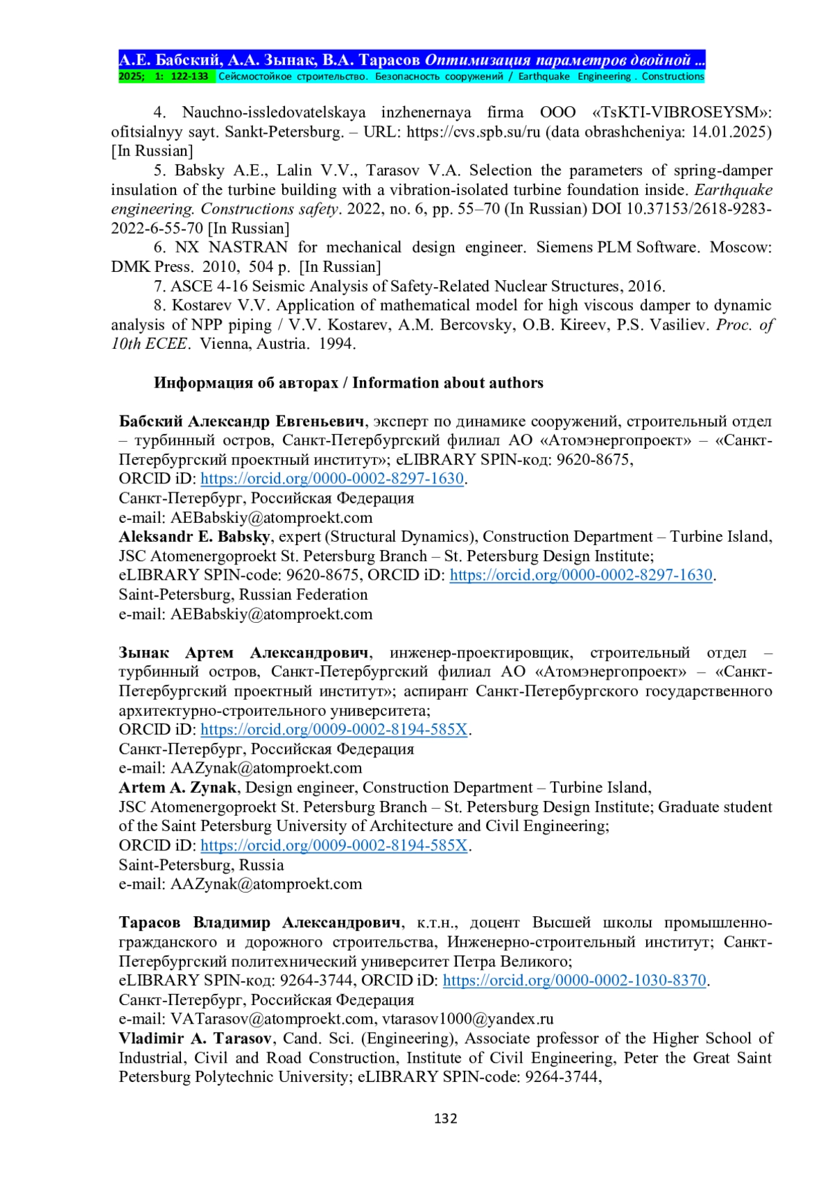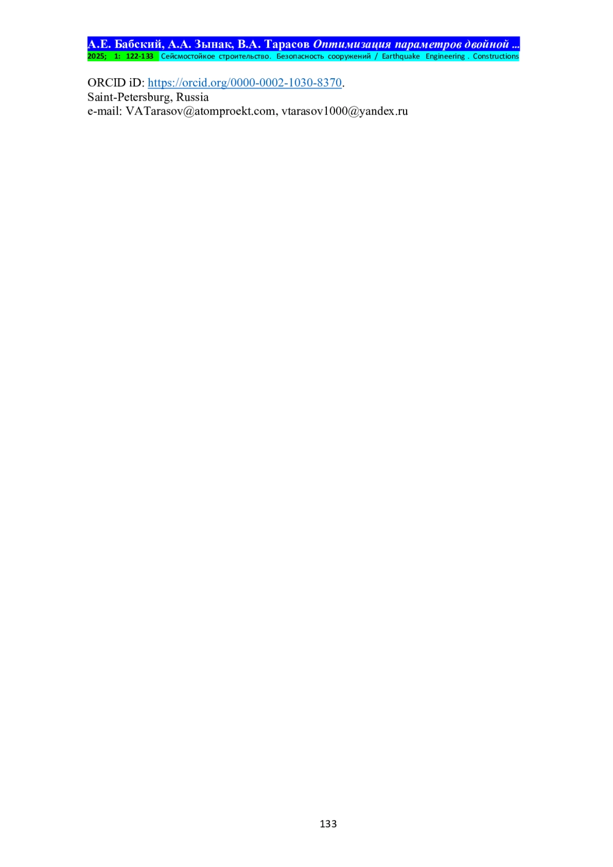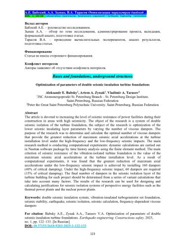 БАБСКИЙ А. Е., ЗЫНАК А. А., ТАРАСОВ В. А. ОПТИМИЗАЦИЯ ПАРАМЕТРОВ ДВОЙНОЙ СЕЙСМОИЗОЛЯЦИИ ФУНДАМЕНТОВ ТУРБОАГРЕГАТОВ // СЕЙСМОСТОЙКОЕ СТРОИТЕЛЬСТВО. БЕЗОПАСНОСТЬ СООРУЖЕНИЙ. 2025. № 1