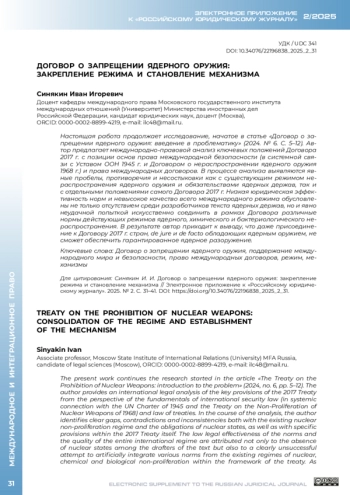 9. Марусин И. С. Договор о запрещении ядерного оружия 2017 года и перспективы его применения // Известия высших учебных заведений. Правоведение. 2018. № 1. С. 20-31. EDN: UYYMIQ
