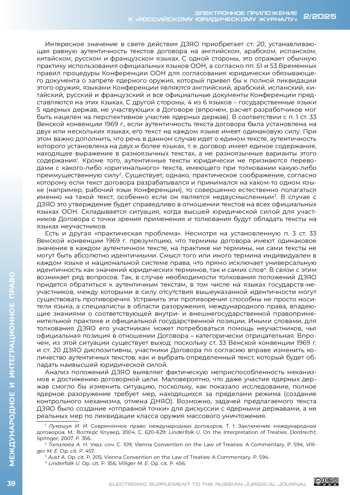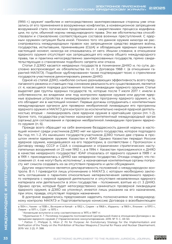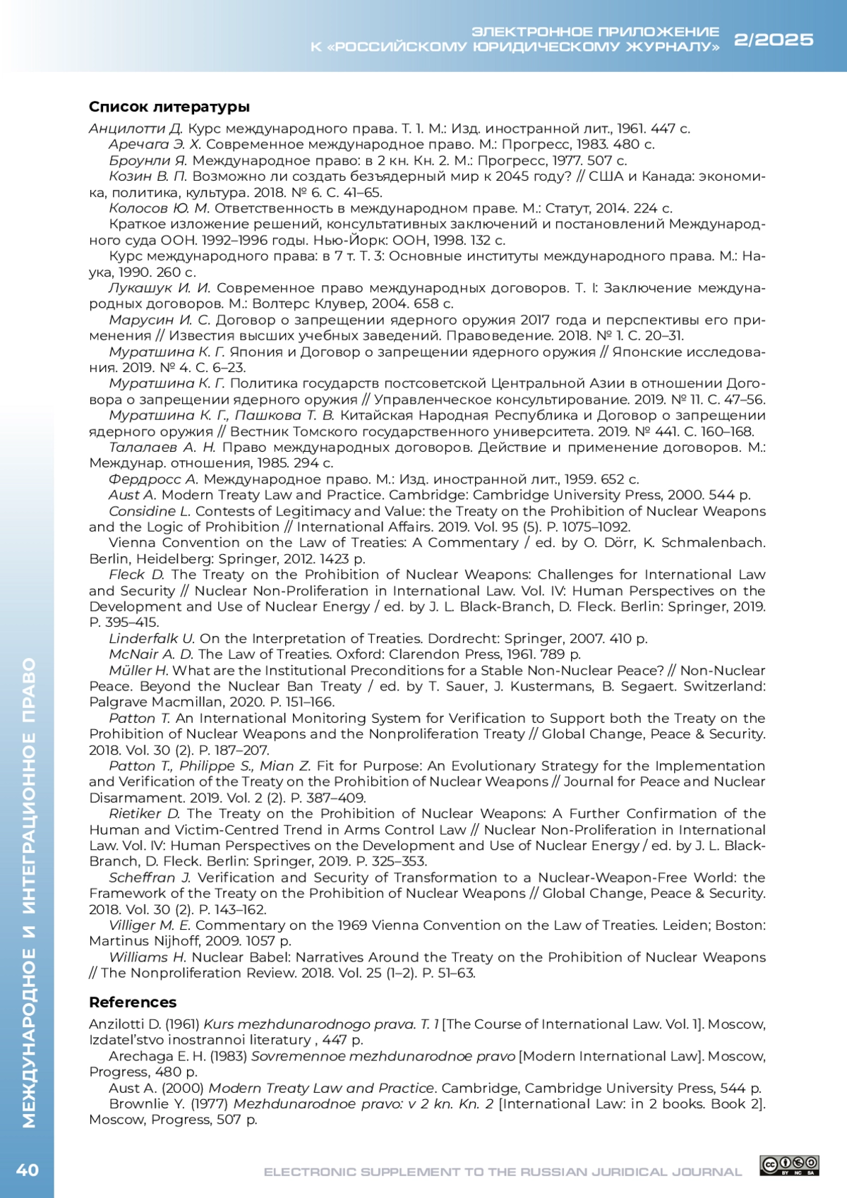 23. Patton T., Philippe S., Mian Z. Fit for Purpose: An Evolutionary Strategy for the Implementation and Verification of the Treaty on the Prohibition of Nuclear Weapons // Journal for Peace and Nuclear Disarmament. 2019. Vol. 2 (2). P. 387-409.