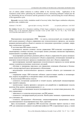 Для решения задачи получения целевых продуктов сжигания черного щелока в топке СРК - карбоната и сульфида натрия - выполнена разработка имитационной модели подсистемы сжигания черного щелока в топке СРК. Разработанная имитационная модель подсистемы сжигания черного щелока в топке СРК даст возможность моделировать процессы: горения черного щелока - для изучения влияния различных факторов (состав черного щелока, расход воздуха, температура) на эффективность сжигания и тепловую мощность СРК; восстановления сульфата натрия - для изучения влияния температуры, состава газов и содержания углерода на скорость восстановления сульфата натрия до сульфида натрия в СРК. Применение имитационной модели подсистемы сжигания черного щелока в топке СРК позволит оптимизировать процесс сжигания, минимизировать выбросы загрязняющих веществ в атмосферу, снизить потребление ресурсов и отходов, а также повысить общую эффективность процессов регенерационного цикла.