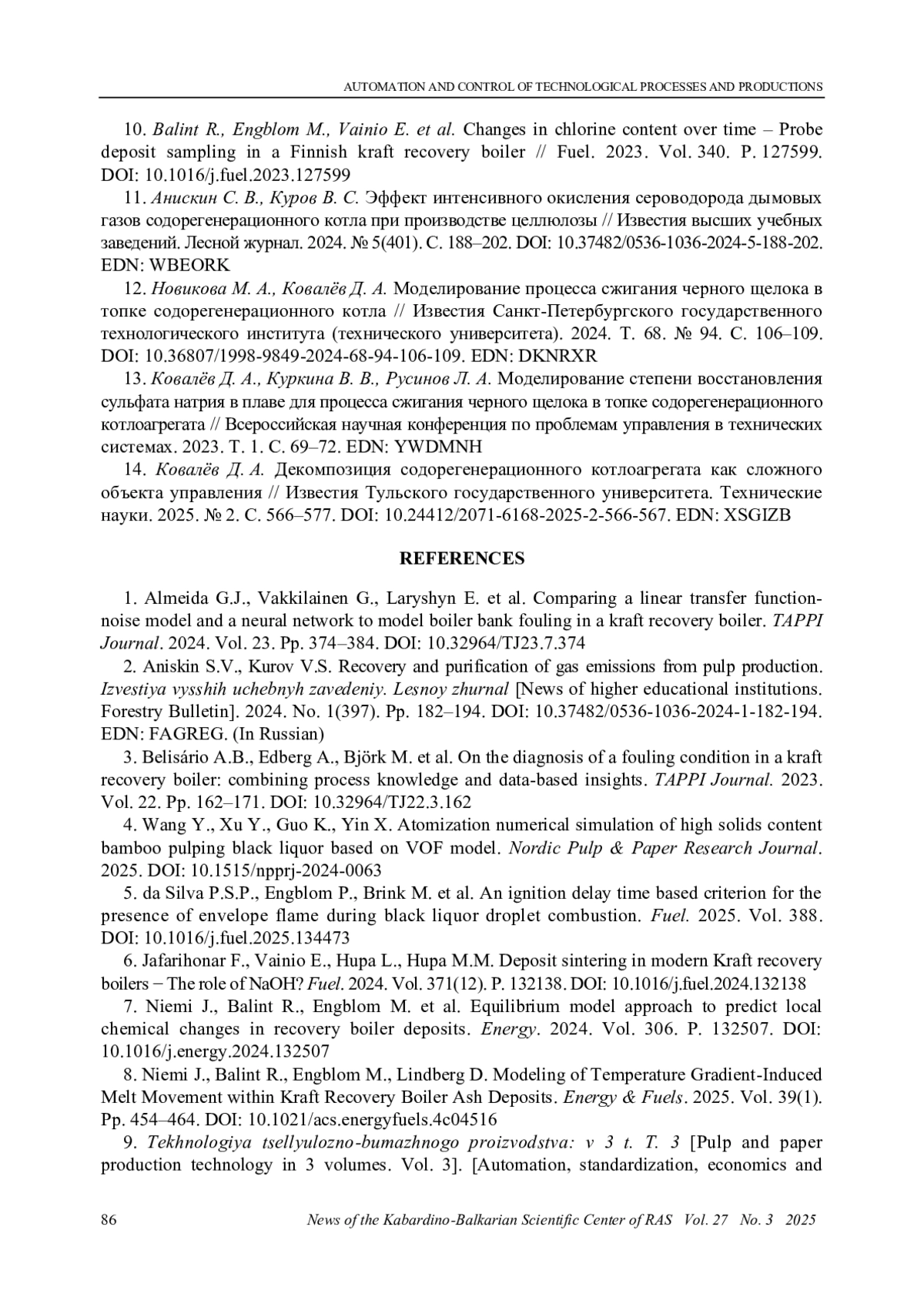 10. Balint R., Engblom M., Vainio E. et al. Changes in chlorine content over time - Probe deposit sampling in a Finnish kraft recovery boiler // Fuel. 2023. Vol. 340. P. 127599. DOI: 10.1016/j.fuel.2023.127599 EDN: SWEZKV