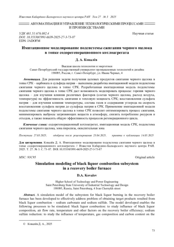 13. Ковалёв Д. А., Куркина В. В., Русинов Л. А. Моделирование степени восстановления сульфата натрия в плаве для процесса сжигания черного щелока в топке содорегенерационного котлоагрегата // Всероссийская научная конференция по проблемам управления в технических системах. 2023. Т. 1. С. 69-72. EDN: YWDMNH