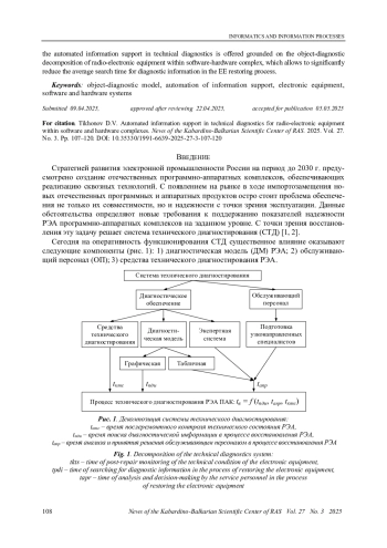 Поддержание работоспособности и своевременное восстановление после отказа радиоэлектронной аппаратуры (РЭА) программно-аппаратных комплексов (ПАК) является важной задачей. Данную задачу на этапе эксплуатации, как правило, решает система технического диагностирования. Для информационной поддержки обслуживающего персонала при выполнении ими задач технического диагностирования разрабатывается диагностическая модель, которая входит в состав диагностического обеспечения изделия. Очевидным преимуществом при выполнении операций технического диагностирования является автоматизация информационной поддержки обслуживающего персонала при техническом диагностировании с применением вычислительных систем. По результатам проведенных исследований в статье предложена автоматизированная система информационной поддержки технического диагностирования на основе объектно-диагностической декомпозиции радиоэлектронной аппаратуры программно-аппаратного комплекса, которая позволяет существенно сократить среднее время поиска диагностической информации в процессе восстановления РЭА.