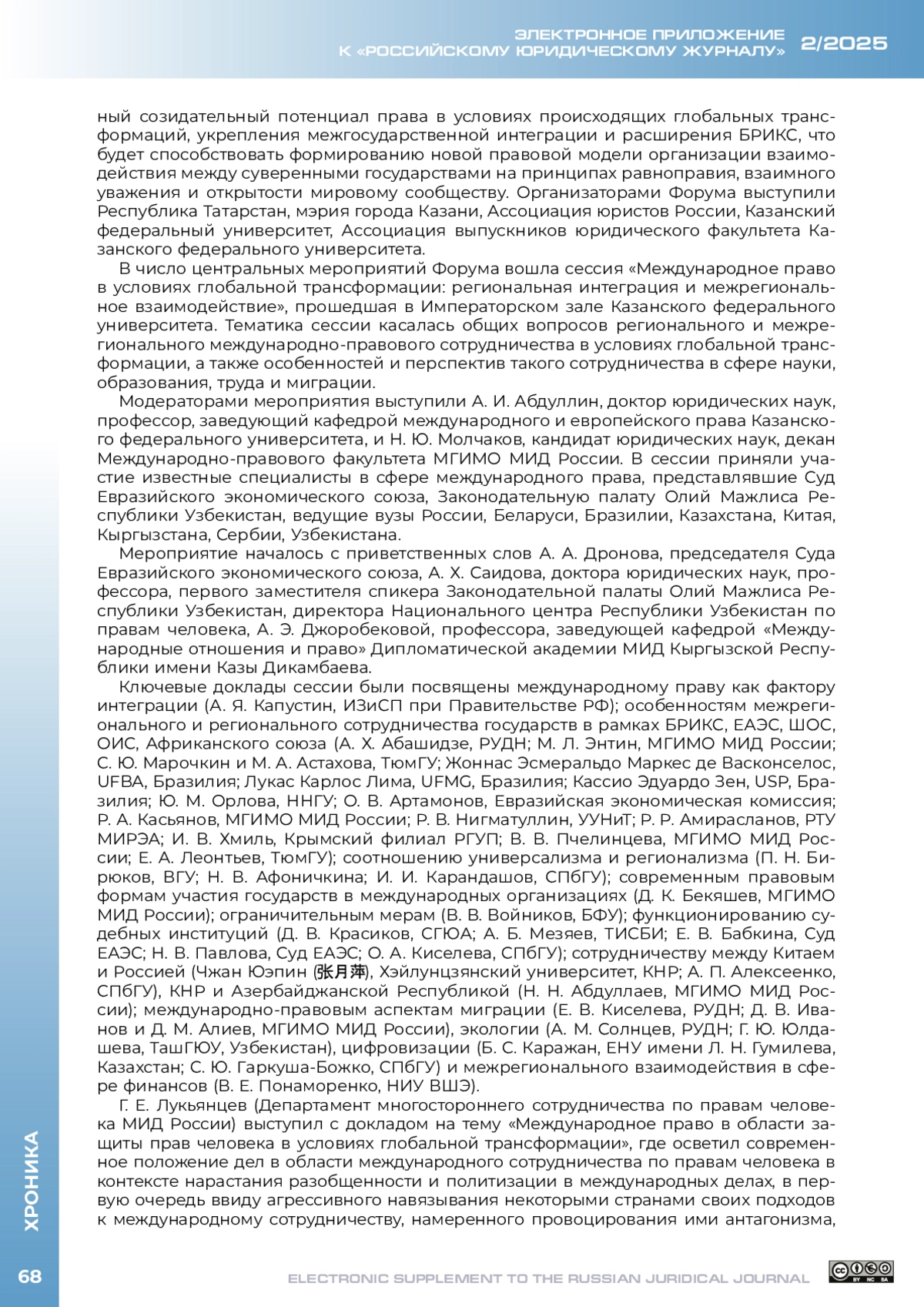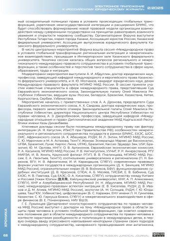 В число центральных мероприятий Форума вошла сессия «Международное право в условиях глобальной трансформации: региональная интеграция и межрегиональное взаимодействие», прошедшая в Императорском зале Казанского федерального университета. Тематика сессии касалась общих вопросов регионального и межрегионального международно-правового сотрудничества в условиях глобальной трансформации, а также особенностей и перспектив такого сотрудничества в сфере науки, образования, труда и миграции.