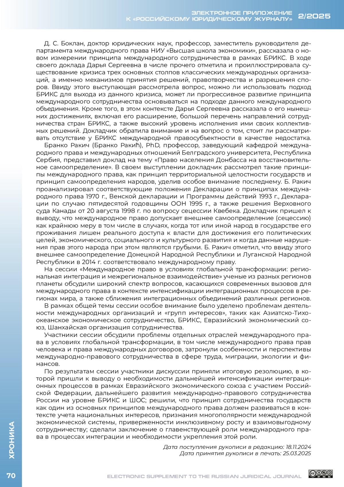 Подготовленная представителями уральской школы международного права монография под ответственной редакцией доктора юридических наук, профессора Л. А. Лазутина и кандидата юридических наук, доцента Р. М. Халафяна посвящена интереснейшей и малоизученной тематике – истории развития отечественной науки международного права. Работа впечатляет уже самим составом авторов, объединяющим набирающих известность юристов-международников: Ю. С. Безбородов, И. А. Ведель, М. А. Лихачев, А. А. Лунев, Н. В. Сметанин, Т. А. Титова, И. В. Федоров, Л. М. Чуркина, Р. М. Халафян. Особенно трогательно в связи с этим упоминание Львом Александровичем Лазутиным в его предисловии к книге того вклада, который внес в отечественную науку Геннадий Владимирович Игнатенко – основатель уральской школы международного права. В этом отношении данный коллективный труд по истории международно-правовых наук сам по себе отражает сложившуюся преемственность поколений и научных традиций.