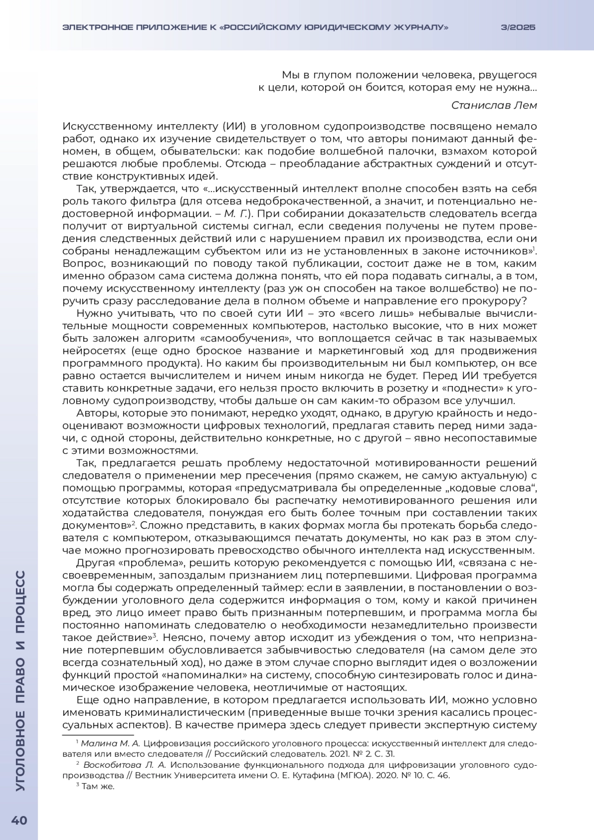 Искусственному интеллекту (ИИ) в уголовном судопроизводстве посвящено немало работ, однако их изучение свидетельствует о том, что авторы понимают данный феномен, в общем, обывательски: как подобие волшебной палочки, взмахом которой решаются любые проблемы. Отсюда – преобладание абстрактных суждений и отсутствие конструктивных идей.