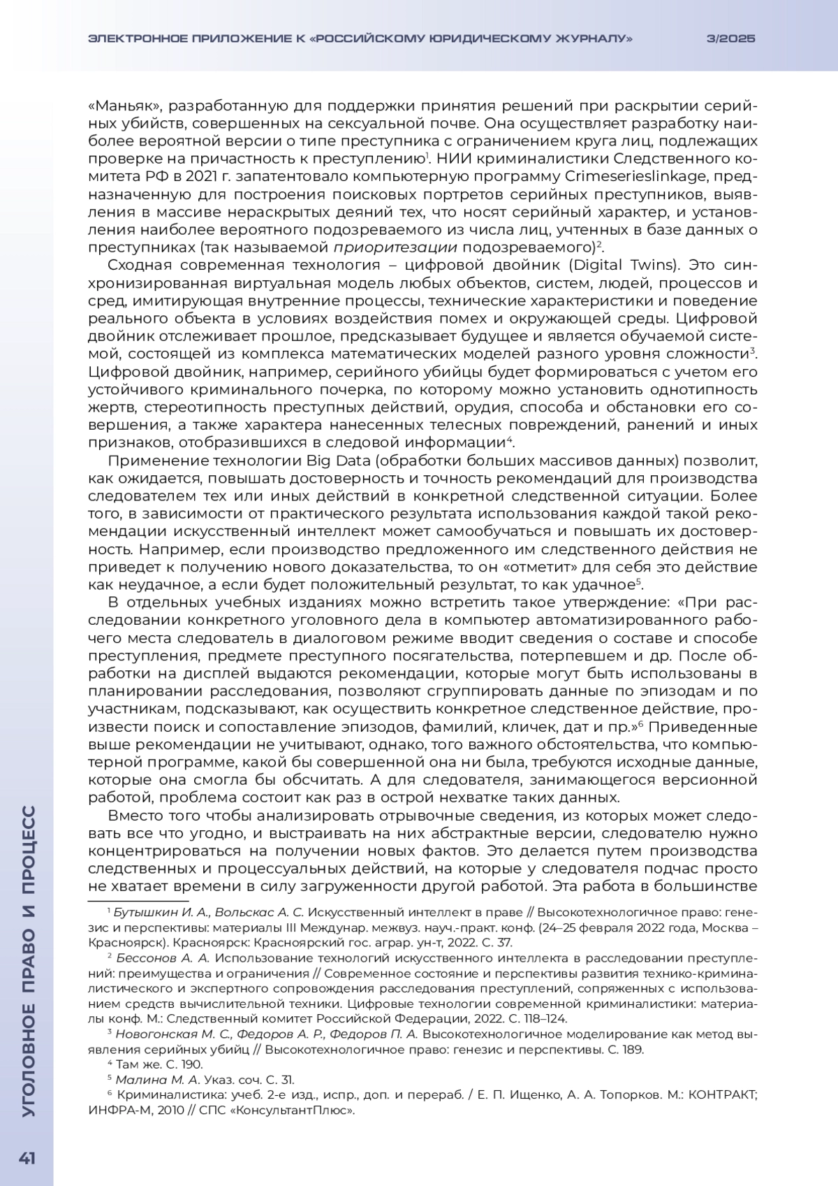 7. Новогонская М. С., Федоров А. Р., Федоров П. А. Высокотехнологичное моделирование как метод выявления серийных убийц // Высокотехнологичное право: генезис и перспективы: материалы III Междунар. межвуз. науч.-практ. конф. (24-25 февраля 2022 года, Москва - Красноярск). Красноярск: Красноярский гос. аграр. ун-т, 2022. С. 188-192. EDN: QTXYDG