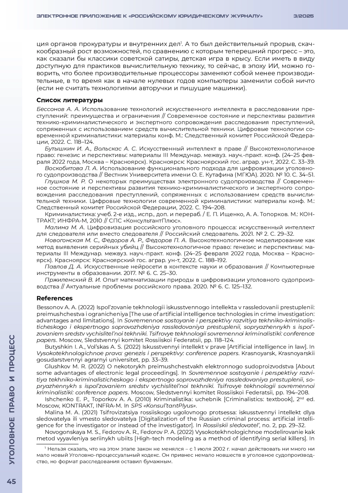 9. Пржиленский В. И. Опыт математизации природы в цифровизации уголовного судопроизводства // Актуальные проблемы российского права. 2020. № 6. С. 125-132. EDN: HUEBFA