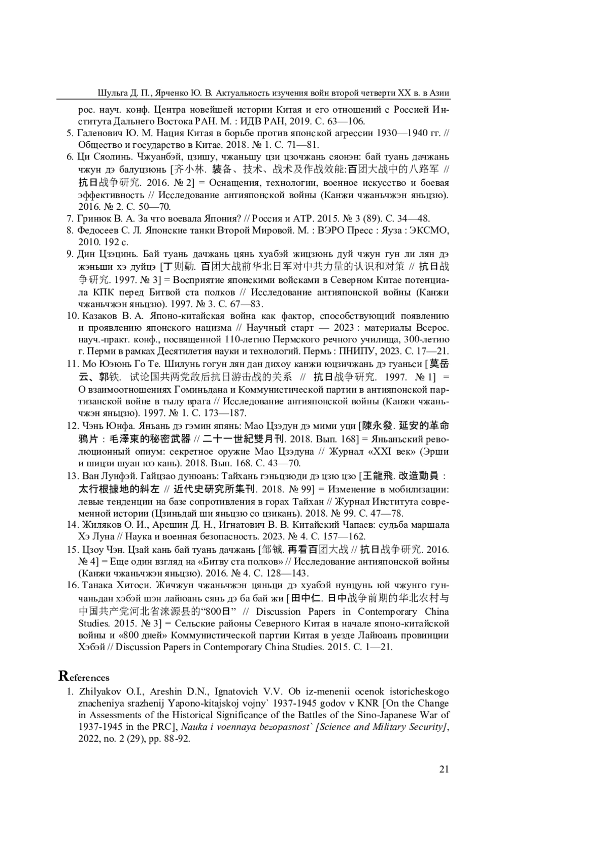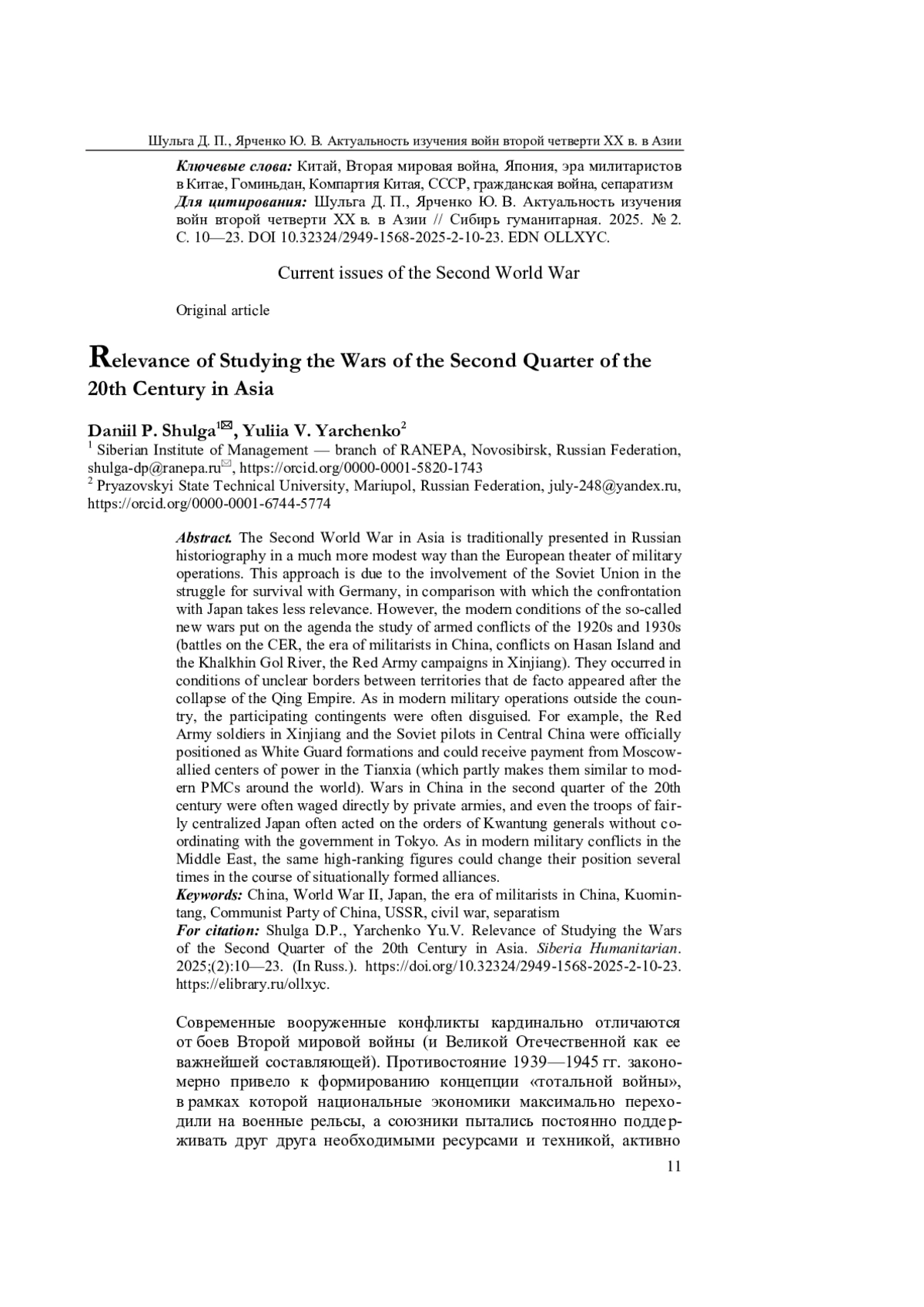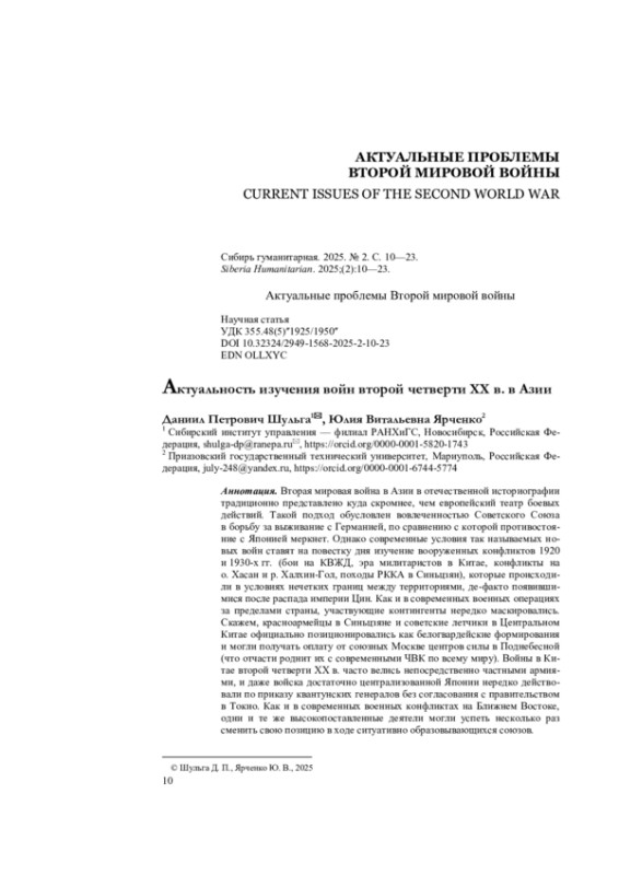 ШУЛЬГА Д. П., ЯРЧЕНКО Ю. В. АКТУАЛЬНОСТЬ ИЗУЧЕНИЯ ВОЙН ВТОРОЙ ЧЕТВЕРТИ XX В. В АЗИИ // СИБИРЬ ГУМАНИТАРНАЯ. 2025. № 2 (10)