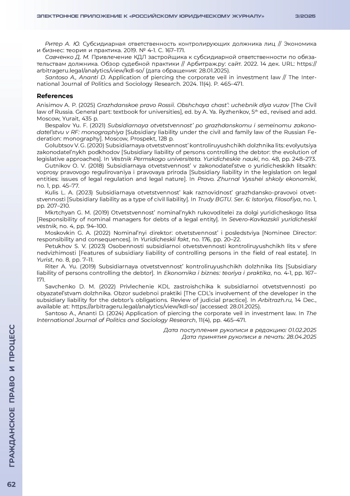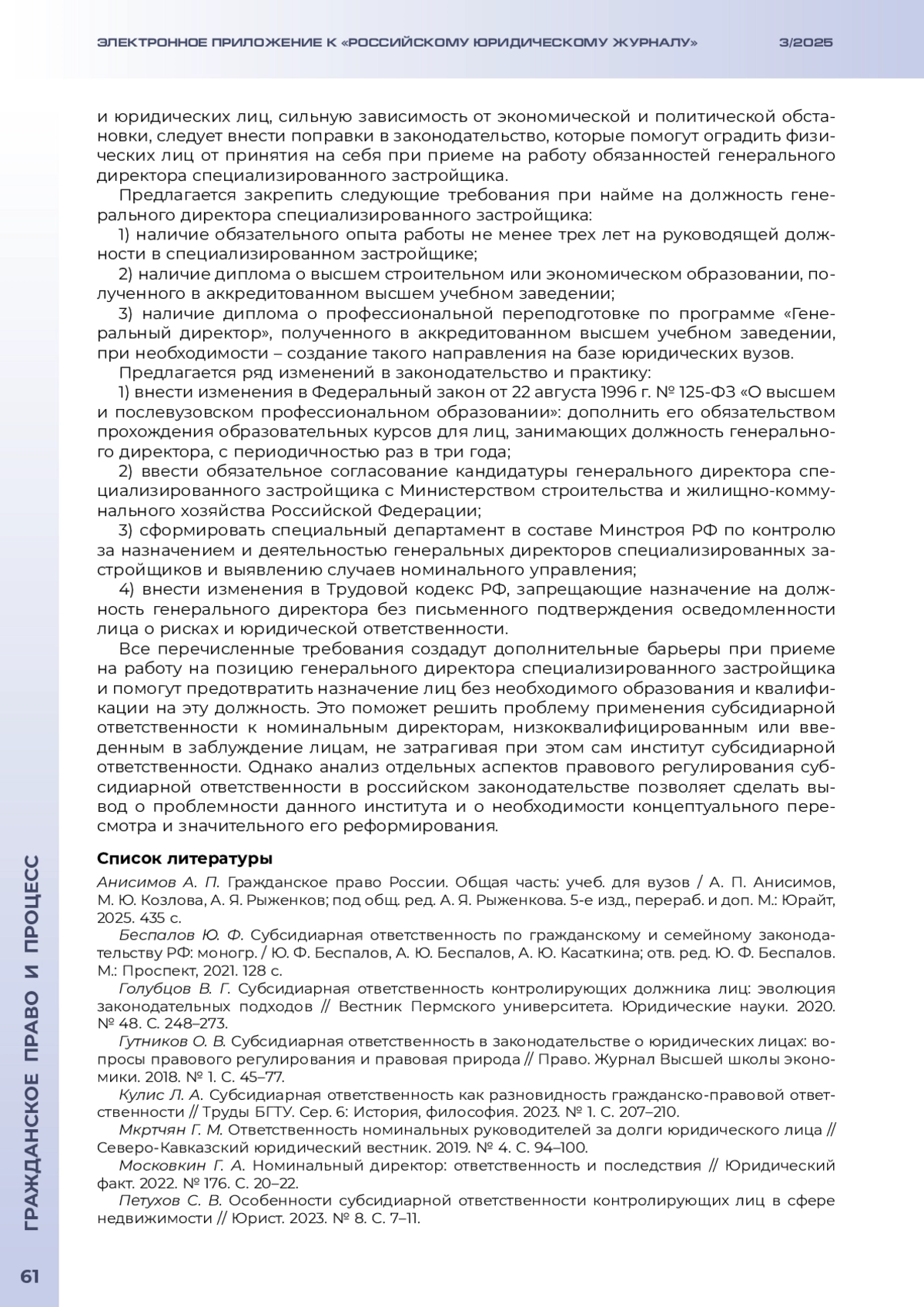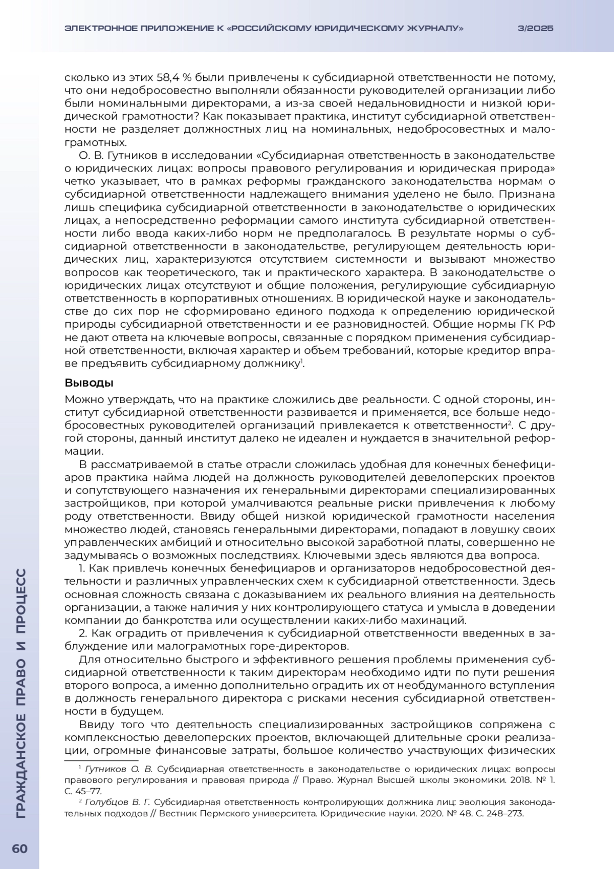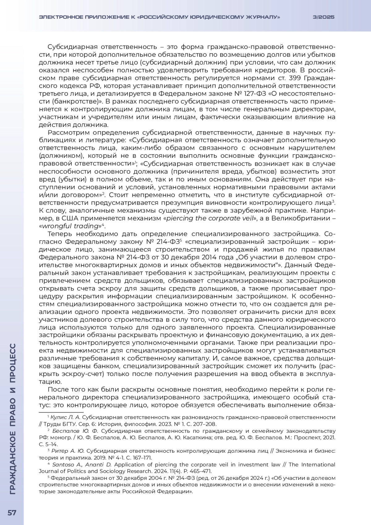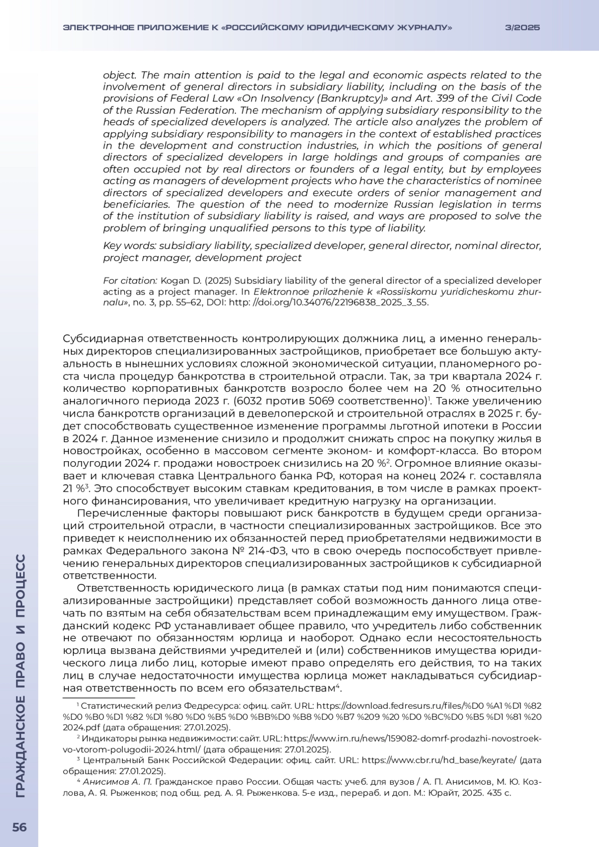 КОГАН Д. И. СУБСИДИАРНАЯ ОТВЕТСТВЕННОСТЬ ГЕНЕРАЛЬНОГО ДИРЕКТОРА СПЕЦИАЛИЗИРОВАННОГО ЗАСТРОЙЩИКА В РОЛИ РУКОВОДИТЕЛЯ ДЕВЕЛОПЕРСКОГО ПРОЕКТА // ЭЛЕКТРОННОЕ ПРИЛОЖЕНИЕ К РОССИЙСКОМУ ЮРИДИЧЕСКОМУ ЖУРНАЛУ. 2025. № 3