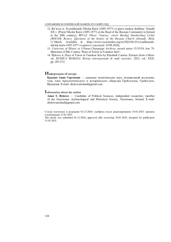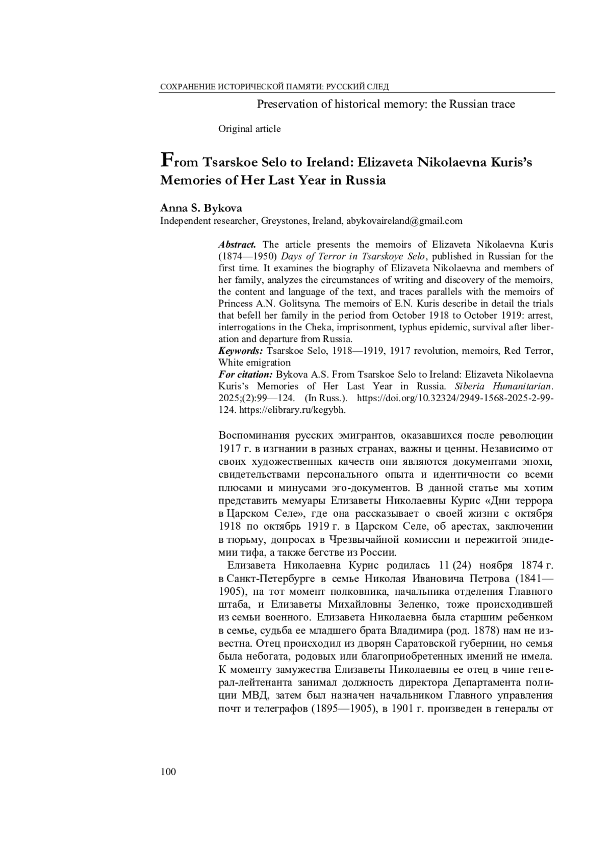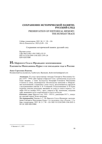 14. Bykova A. Days of Terror in Tsarskoe Selo by Elizabeth Couriss: Extracts from a Memoir // RUSSIcA ROMANA. Rivista internazionale di studi russistici. 2023. Vol. XXX. P. 203-212.