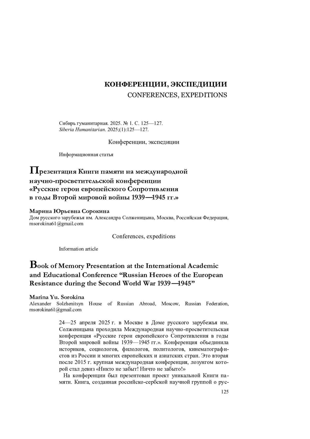 24—25 апреля 2025 г. в Москве в Доме русского зарубежья им. Солженицына проходила Международная научно-просветительская конференция «Русские герои европейского Сопротивления в годы Второй мировой войны 1939—1945 гг.». Конференция объединила историков, социологов, филологов, политологов, кинематографистов из России и многих европейских и азиатских стран. Это вторая после 2015 г. крупная международная конференция, лозунгом которой стал девиз «Никто не забыт! Ничто не забыто!»